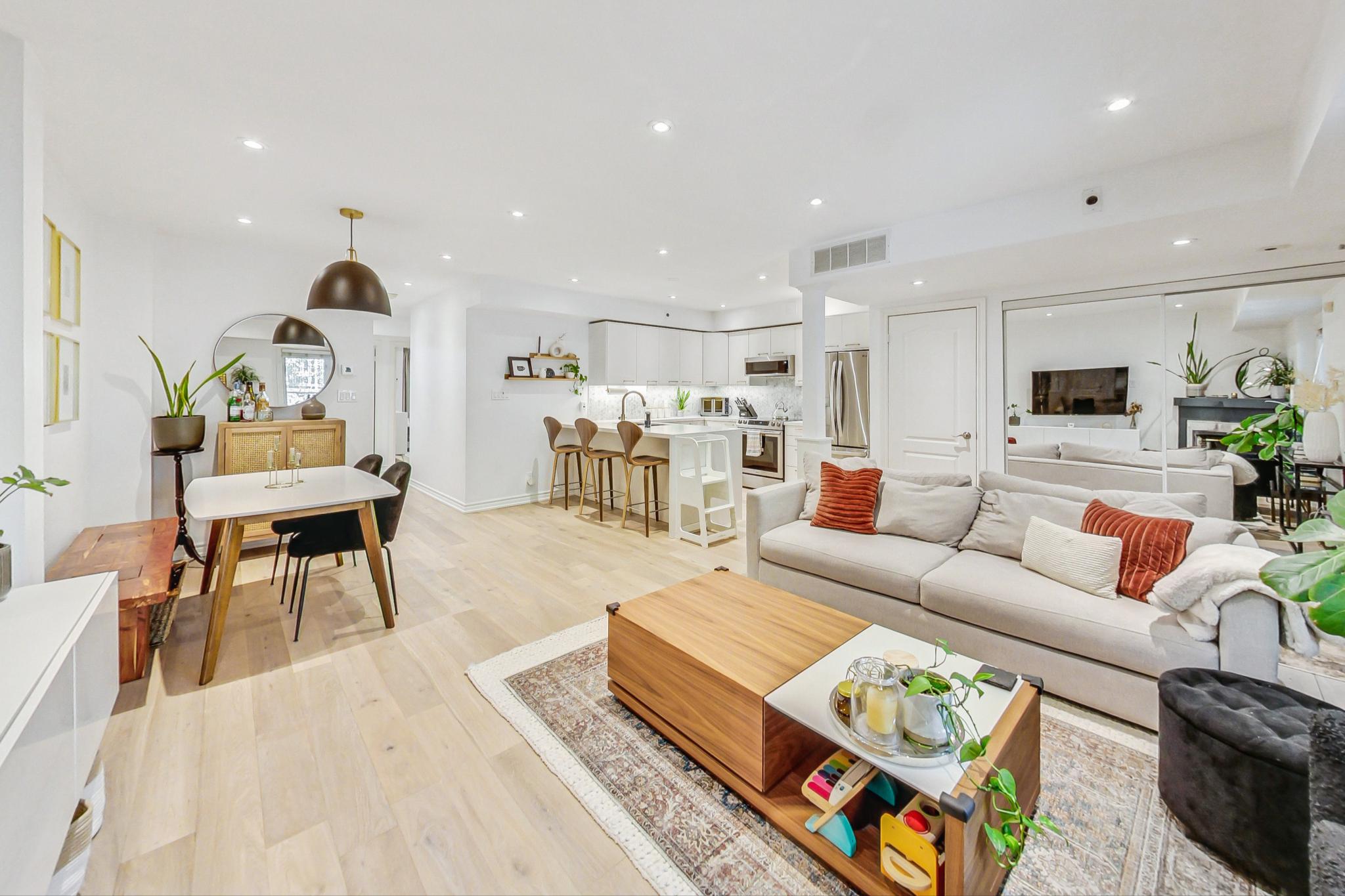 The chef’s kitchen features quartz countertops, a convenient breakfast bar, and stainless steel appliances, while the open-concept layout offers seamless flow between the living and dining areas.