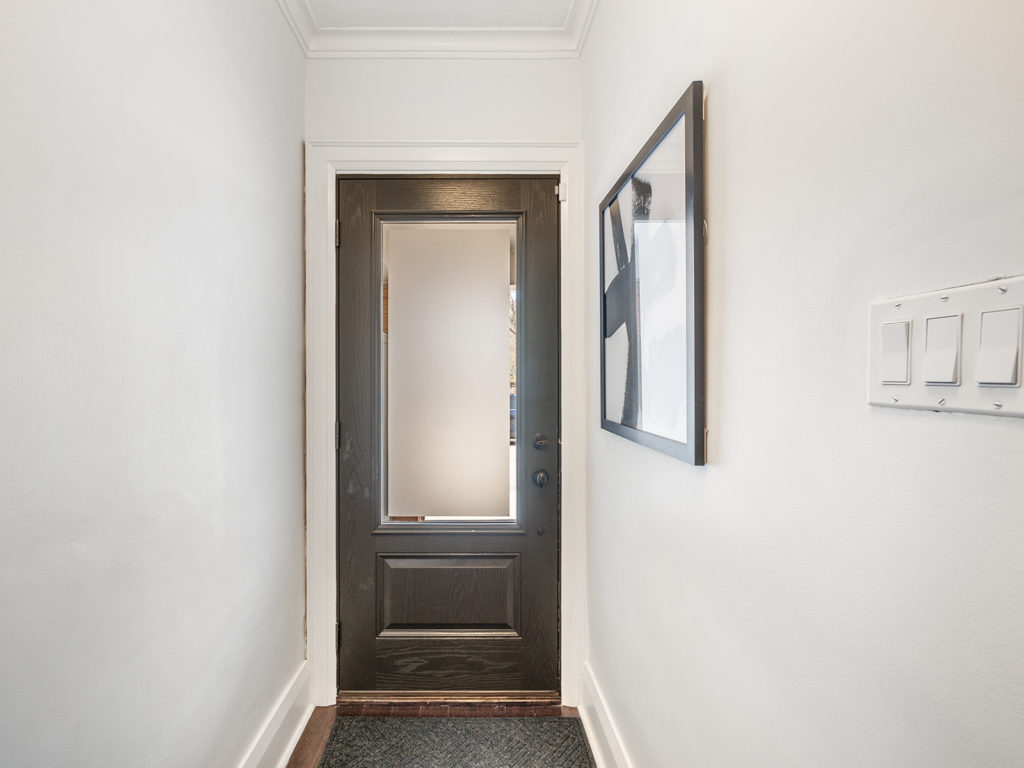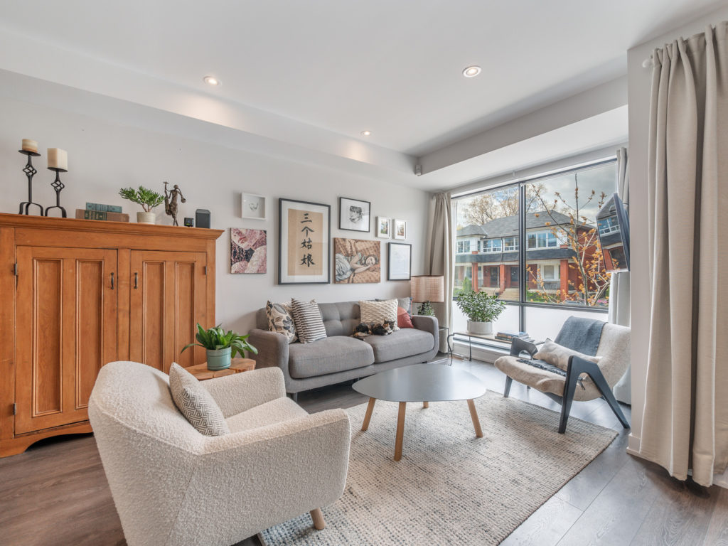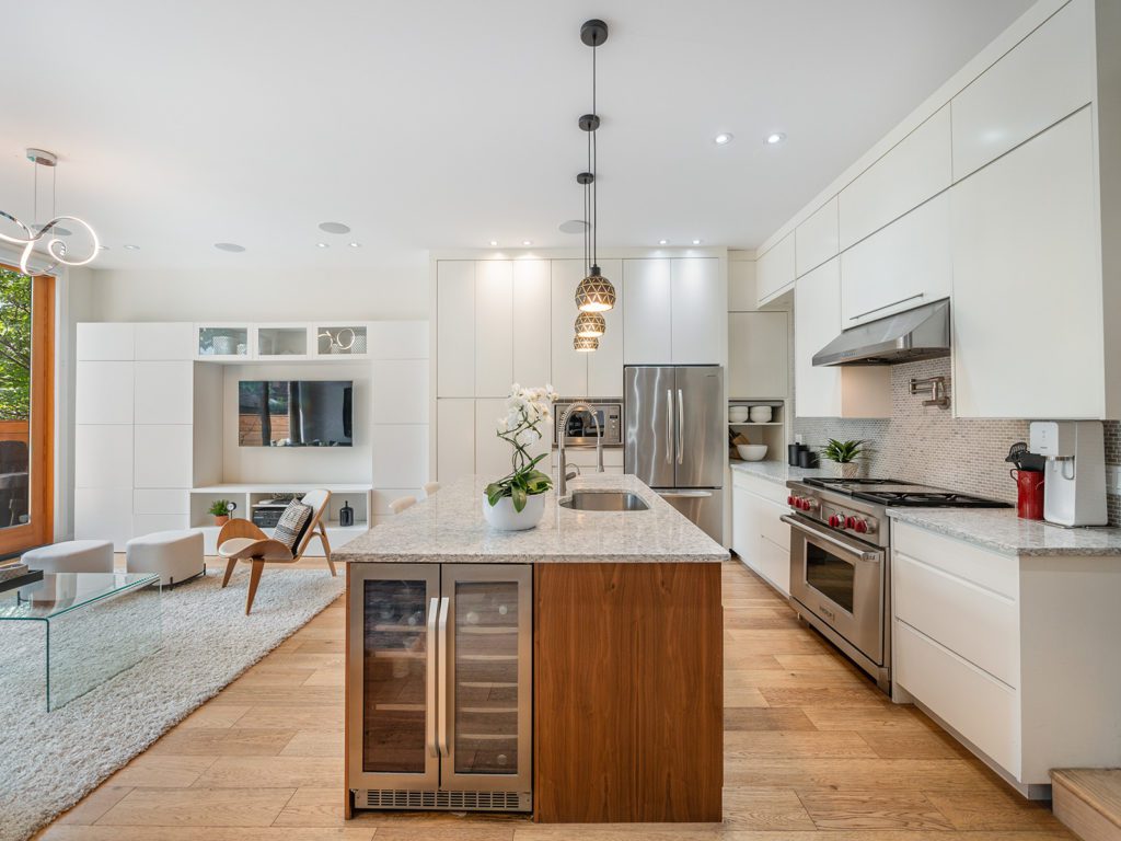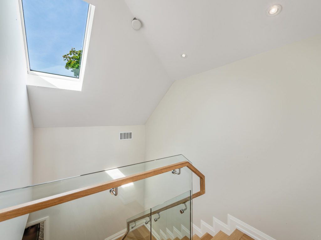 With approximately 2,800 sq. ft. of living space, plus another 1,000 sq. ft. in the basement, the property offers endless options for entertaining, working, and hosting family & friends. Luxurious finishings have been used throughout the home such as copper, glass, stainless steel & walnut. Wide plank white oak flooring coupled with a custom glass wraparound staircase spanning 4 storeys sets the tone of airiness in the home with windows on all sides. It is truly a stunning centrepiece statement in this home.