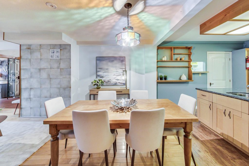 The main floor offers an open concept living & dining room. A custom copper mantel complements the copper fireplace. The oversized sunlit family room & custom chef’s kitchen are the centre hub of this home. This space boasts 9’5” soaring ceilings and floor-to-ceiling glass windows & doors, stainless steel appliances, custom banquette, built-in sound speakers, and centre island. Entertain seamlessly through the patio doors onto the cedar deck and into the back yard.