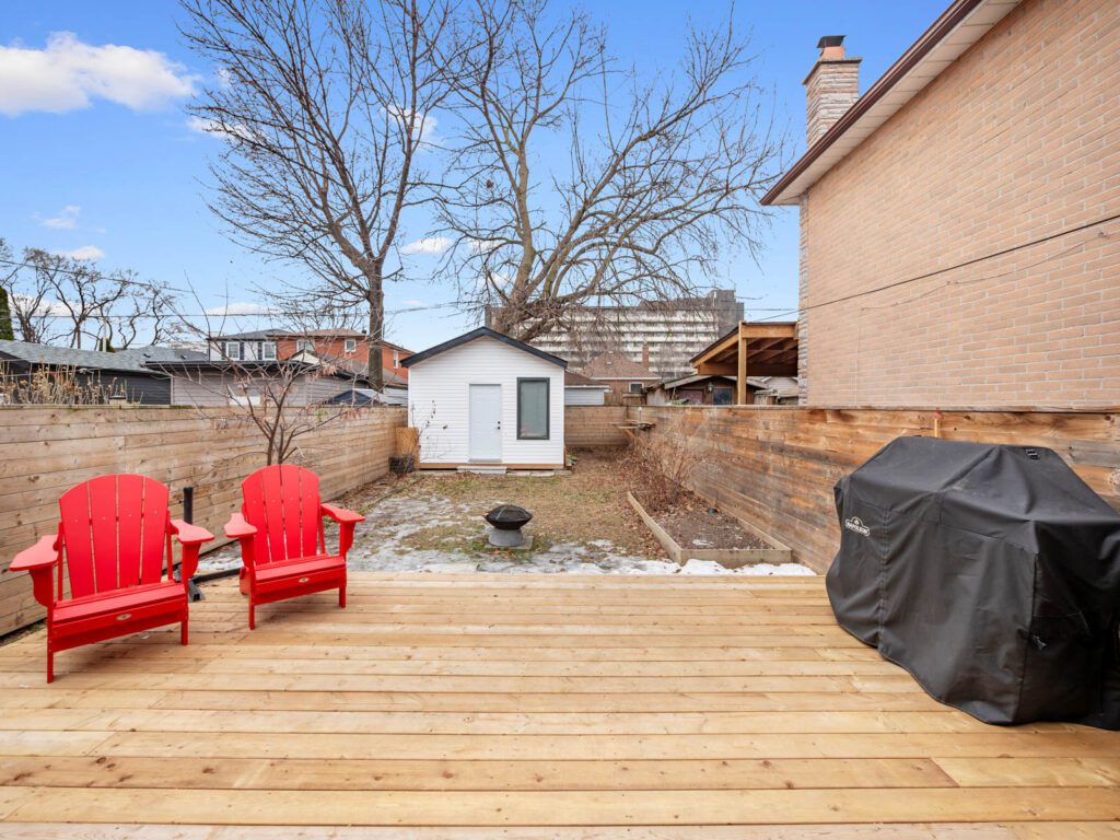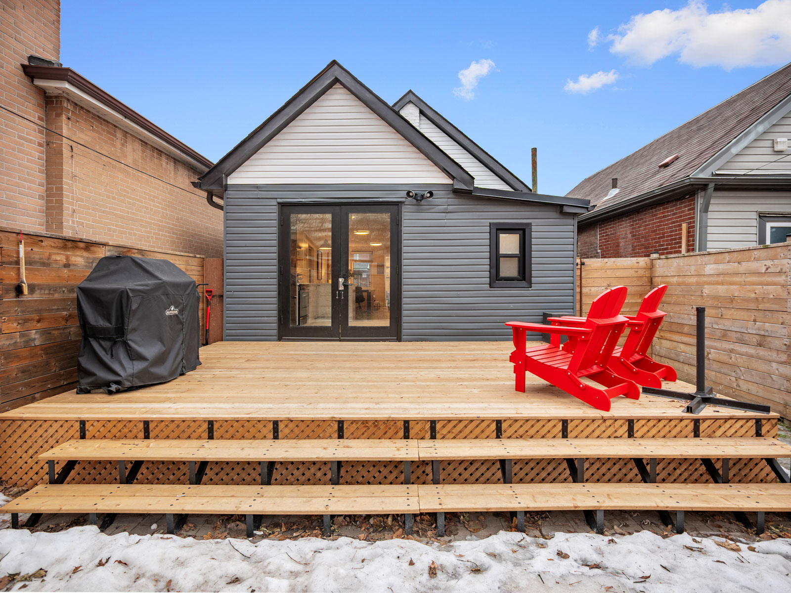 Inside, the open-concept main floor is designed for easy living and entertaining, featuring three generous living, dining, and kitchen areas under soaring 9-foot ceilings. The spacious kitchen, impressive by Bloor West standards, includes ample cabinetry and counter space, with a convenient mudroom at the rear leading to a private fenced backyard. This outdoor oasis includes a gazebo-covered turf area, garden shed, and laneway parking.