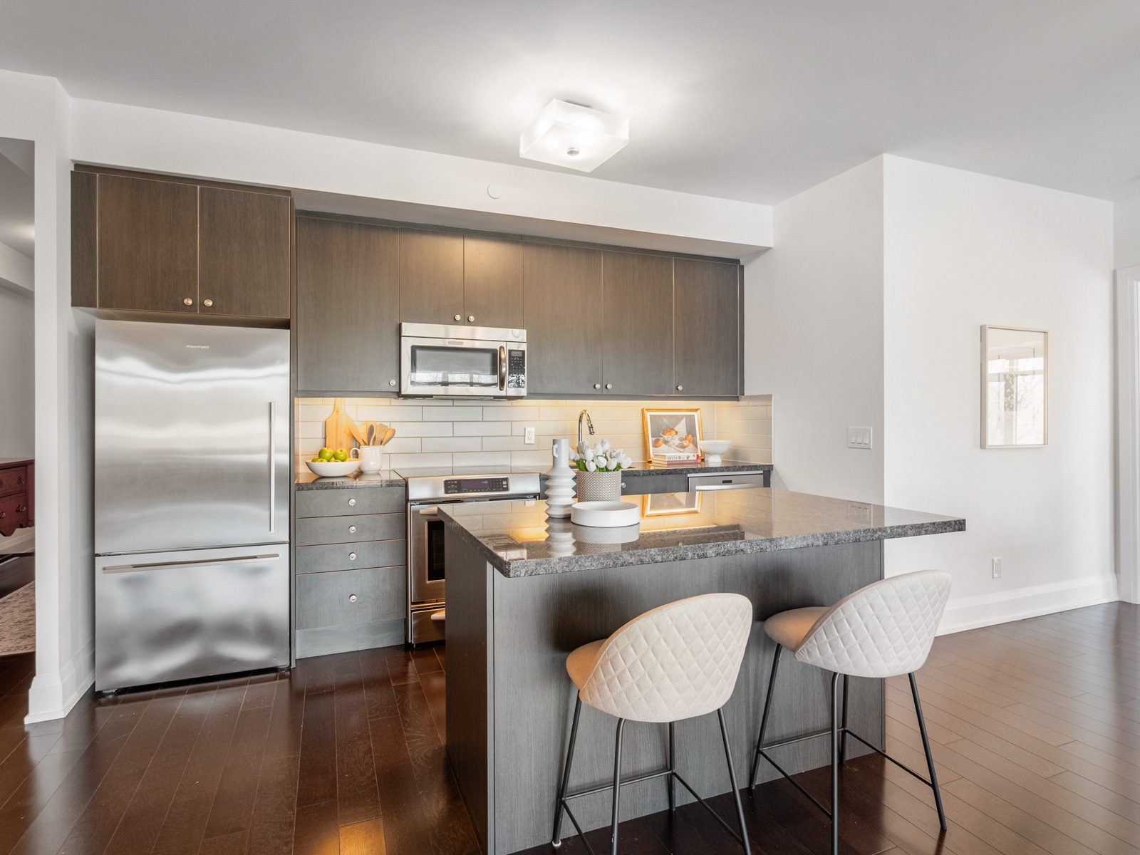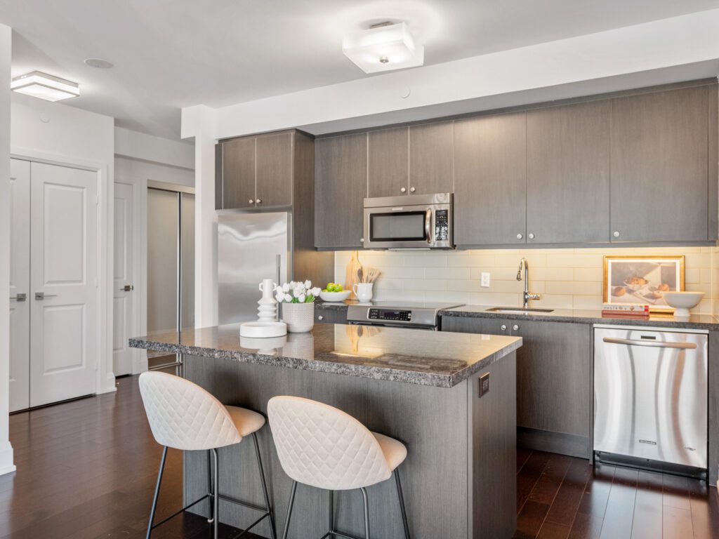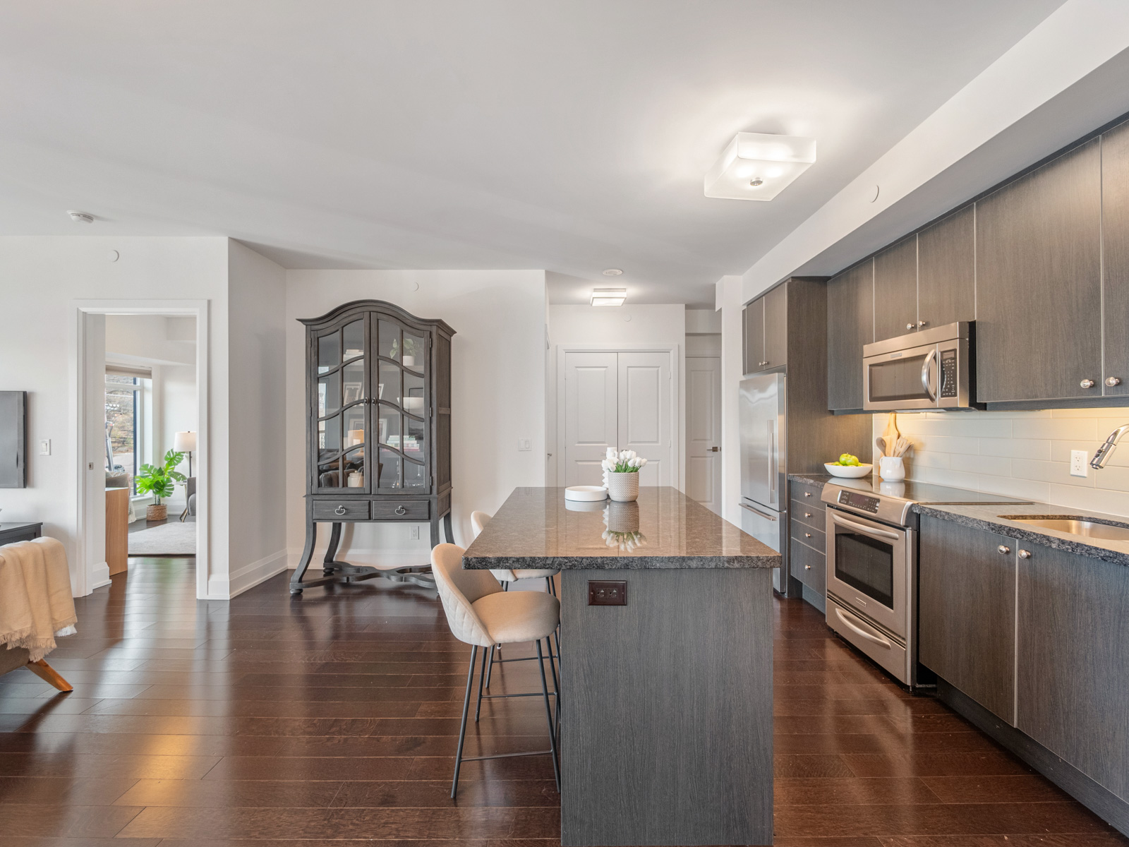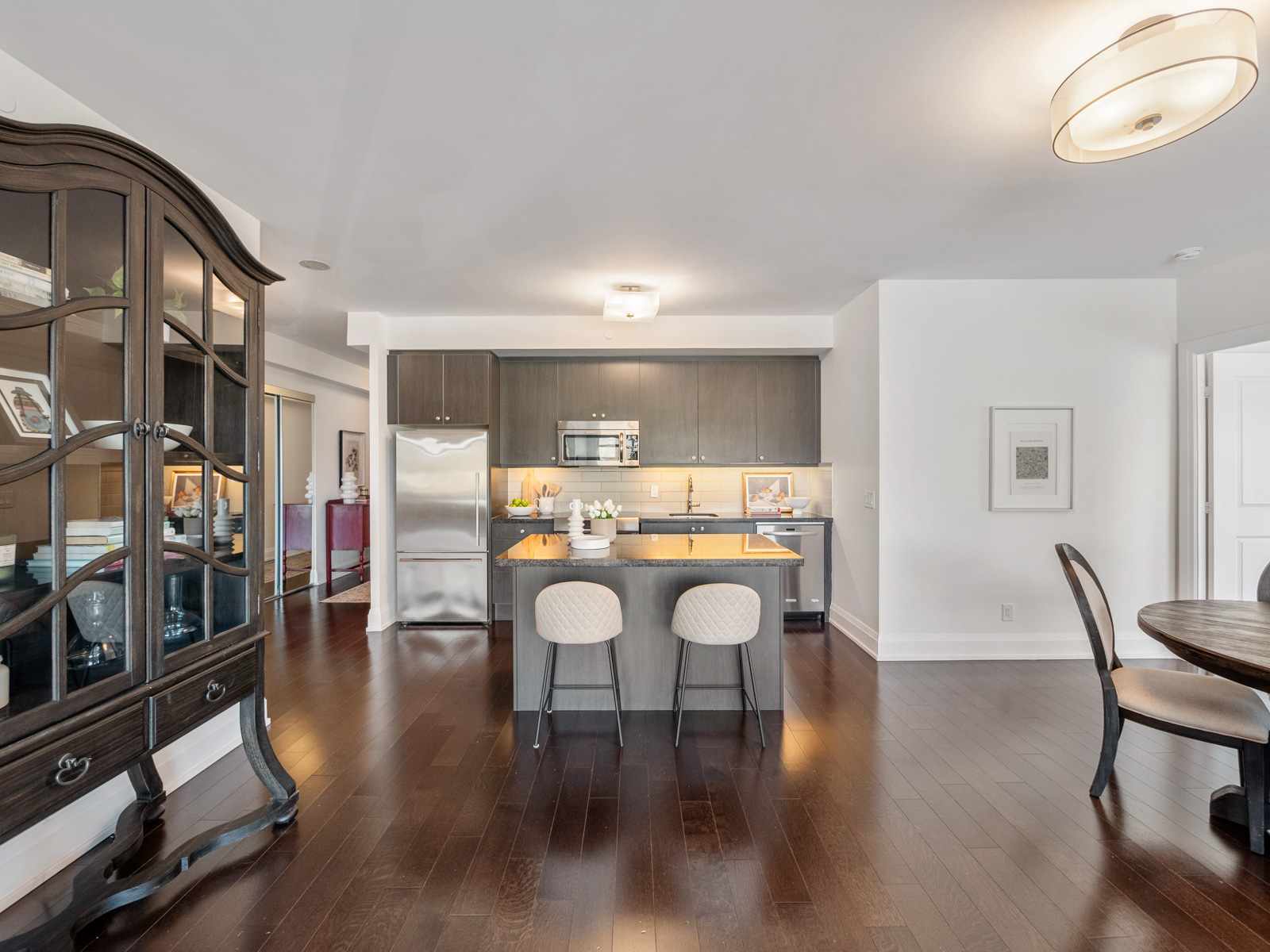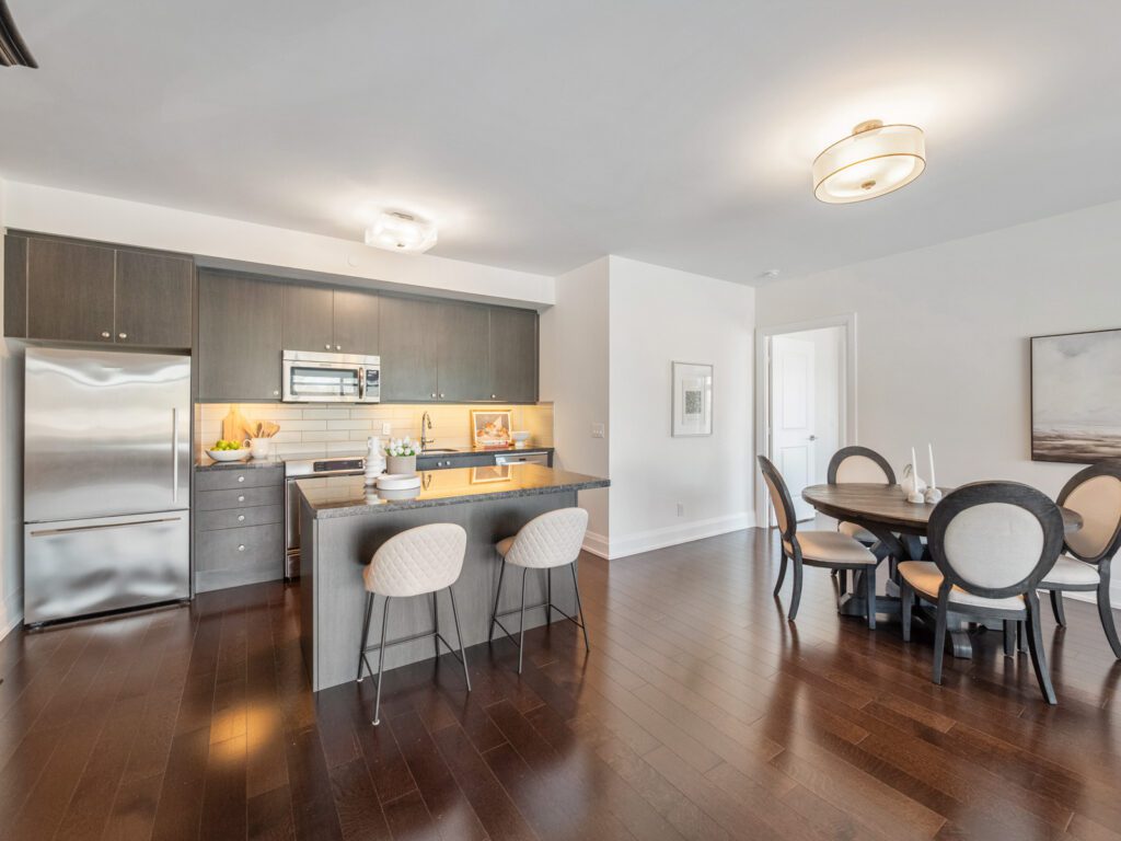 The open-concept kitchen, living, and dining areas are designed for both everyday living and effortless entertaining. A modern kitchen features sleek flat-panel cabinetry, stainless steel appliances, and a well-designed centre island with seating, seamlessly connecting to the spacious principal rooms.