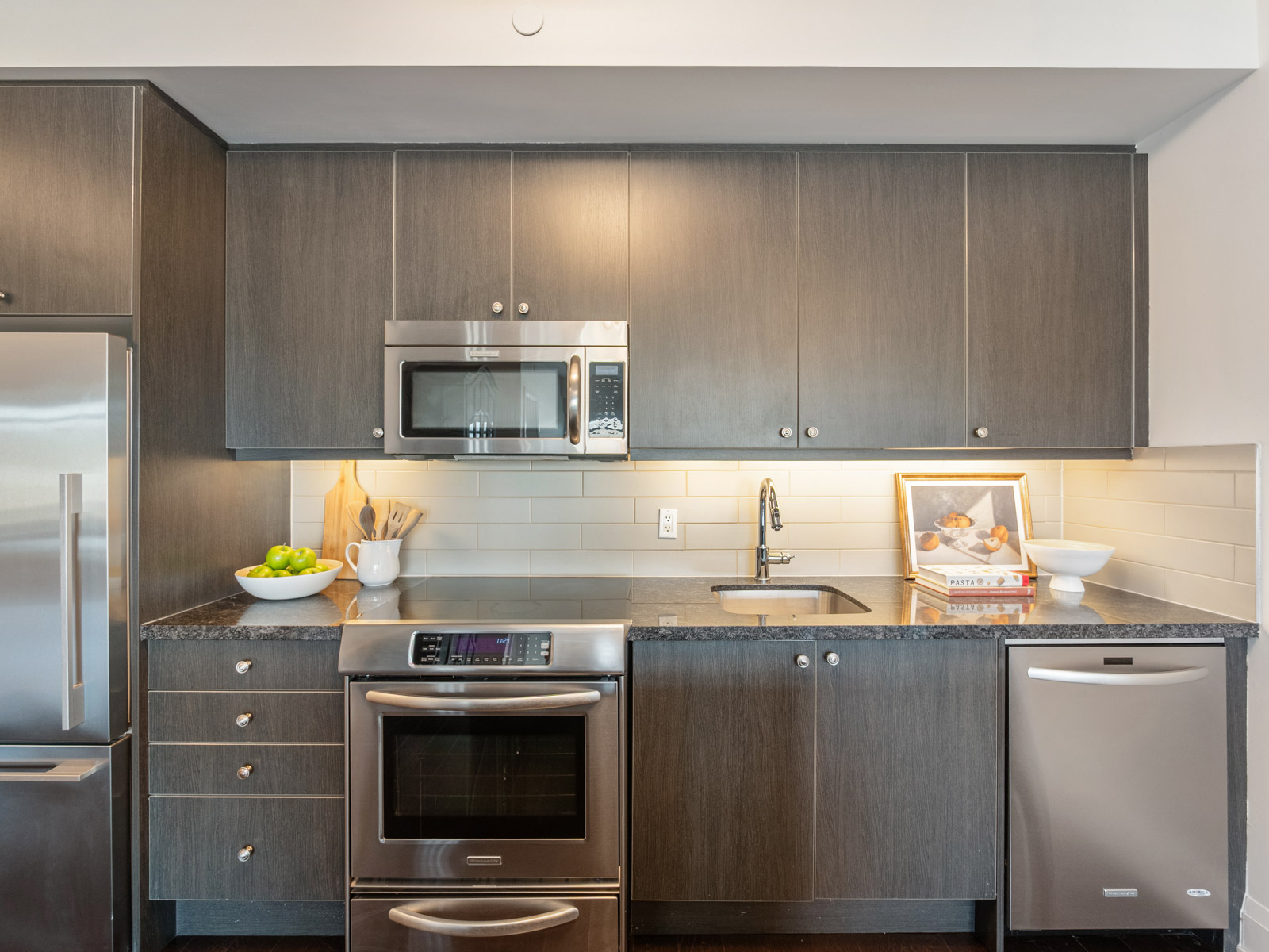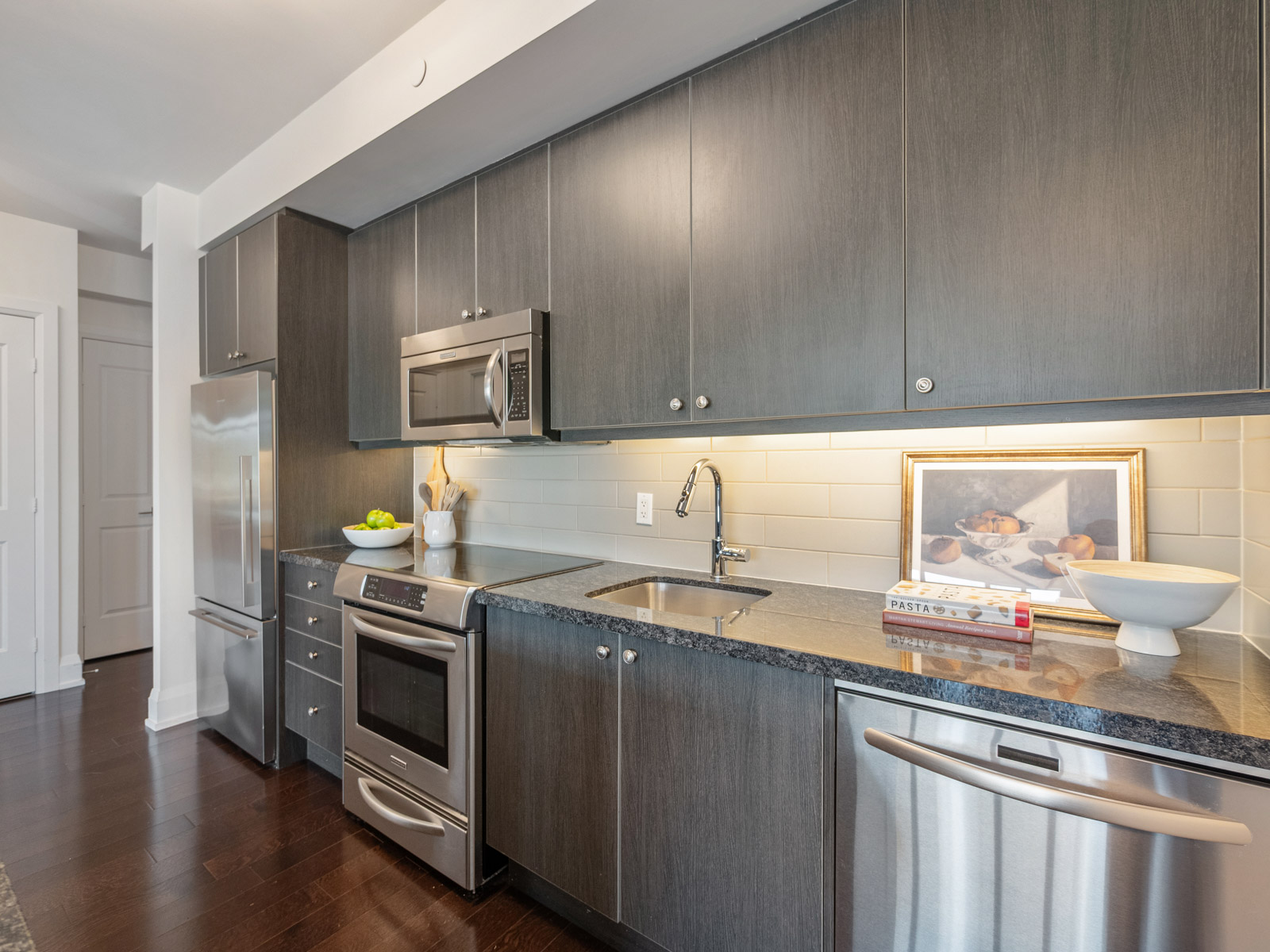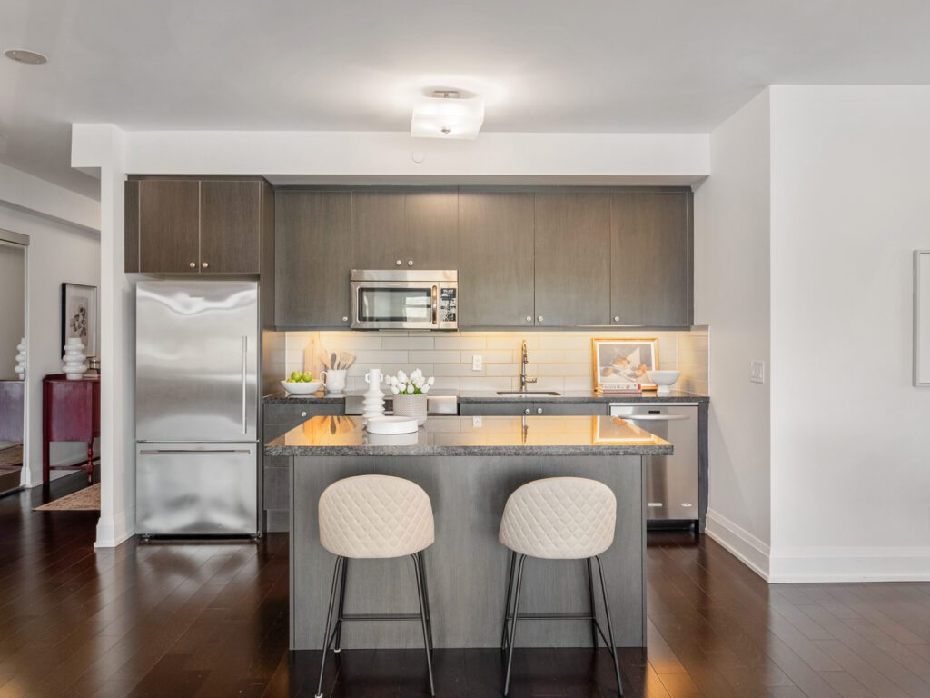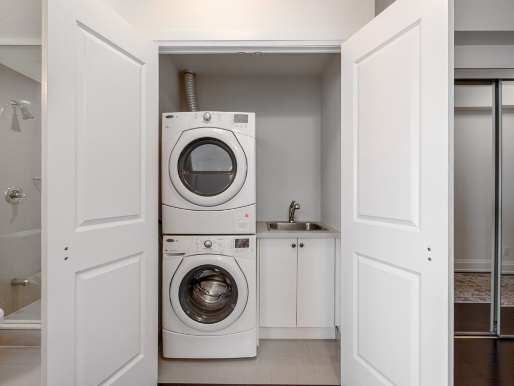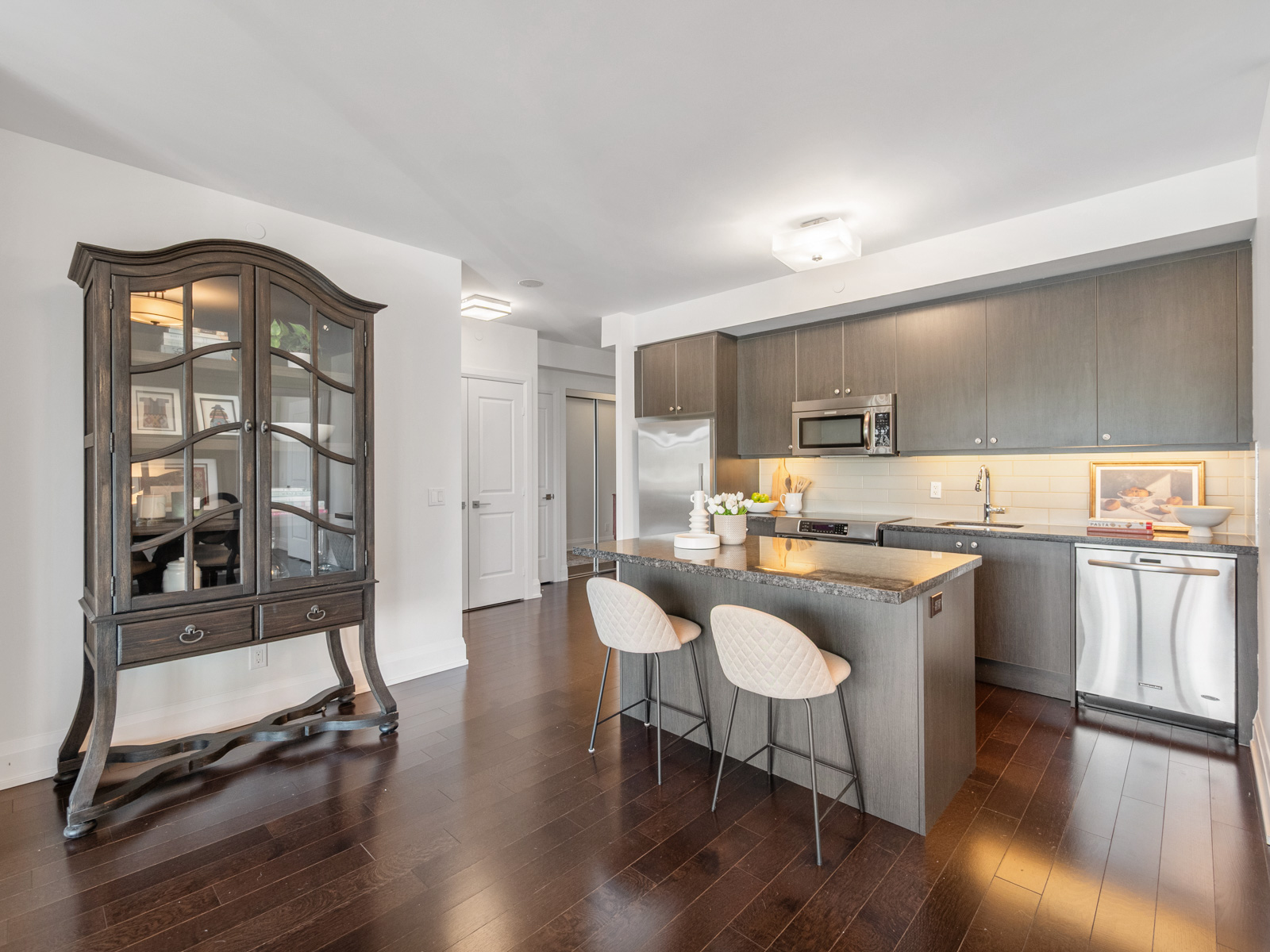Additional conveniences include in-suite laundry, a locker located on the same floor, and one underground parking space. A unique advantage of this suite is direct second-floor access to the street, offering added ease without the need to pass through the main lobby.