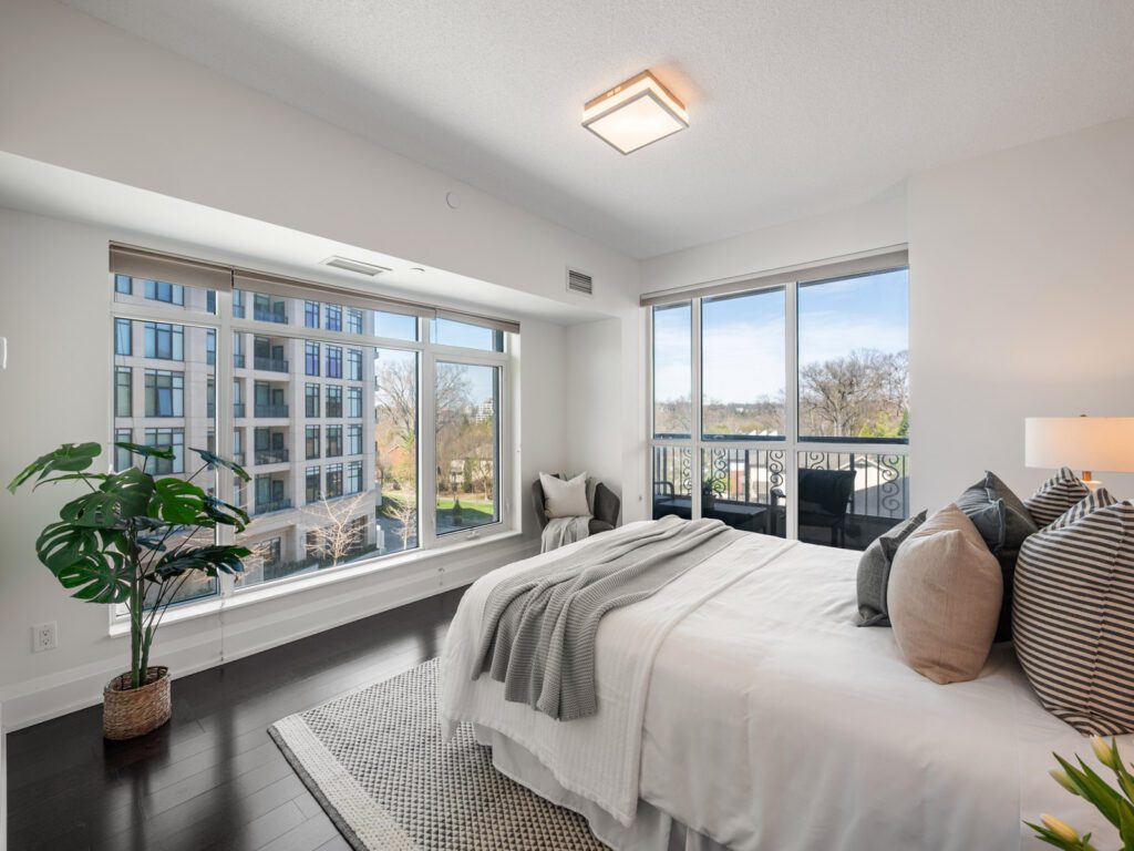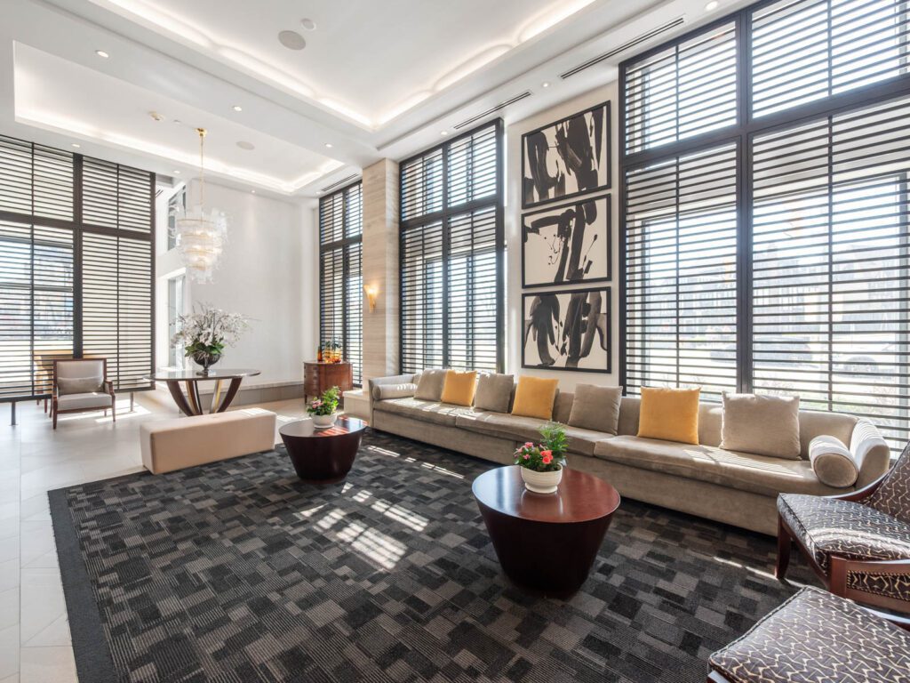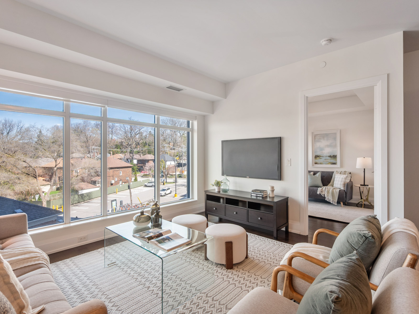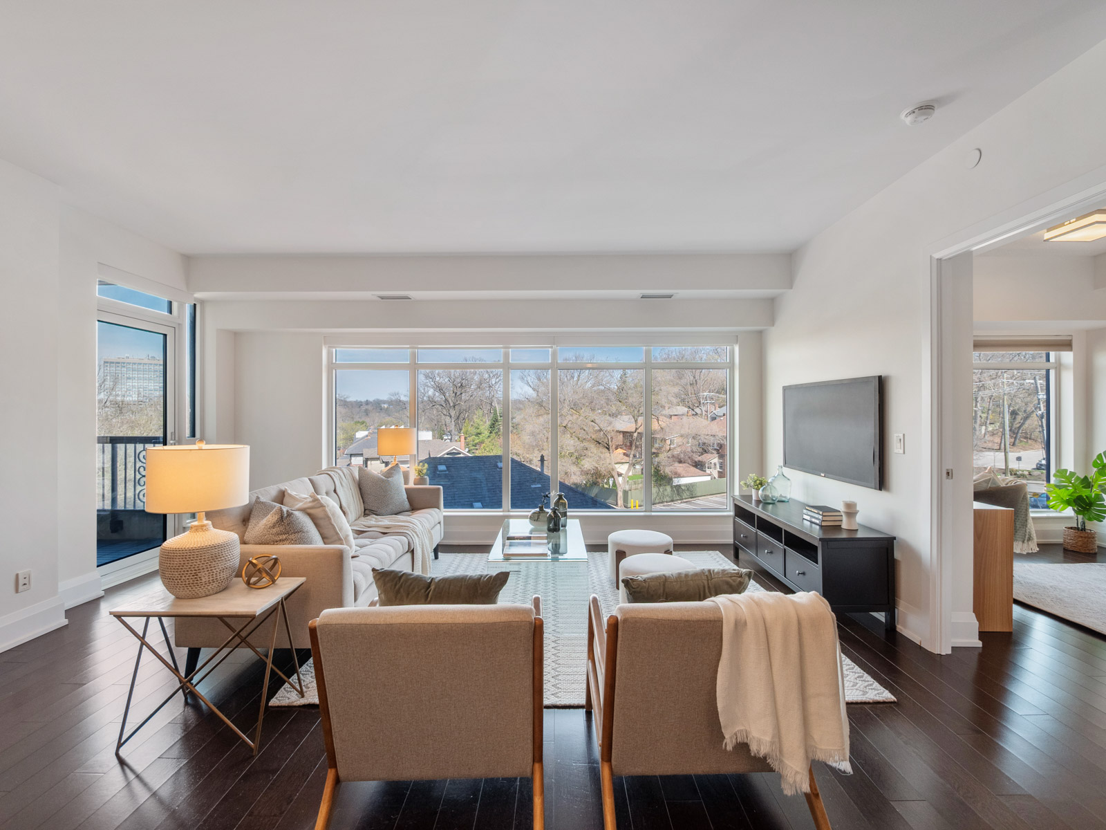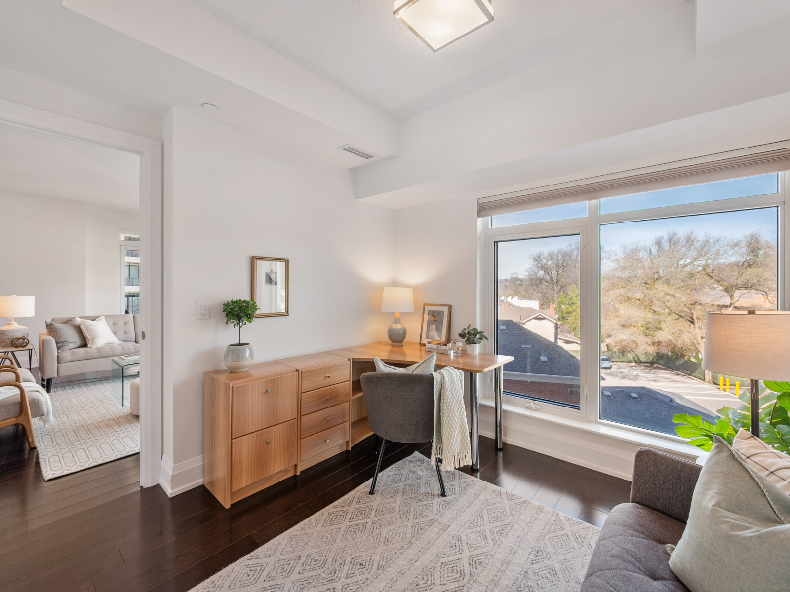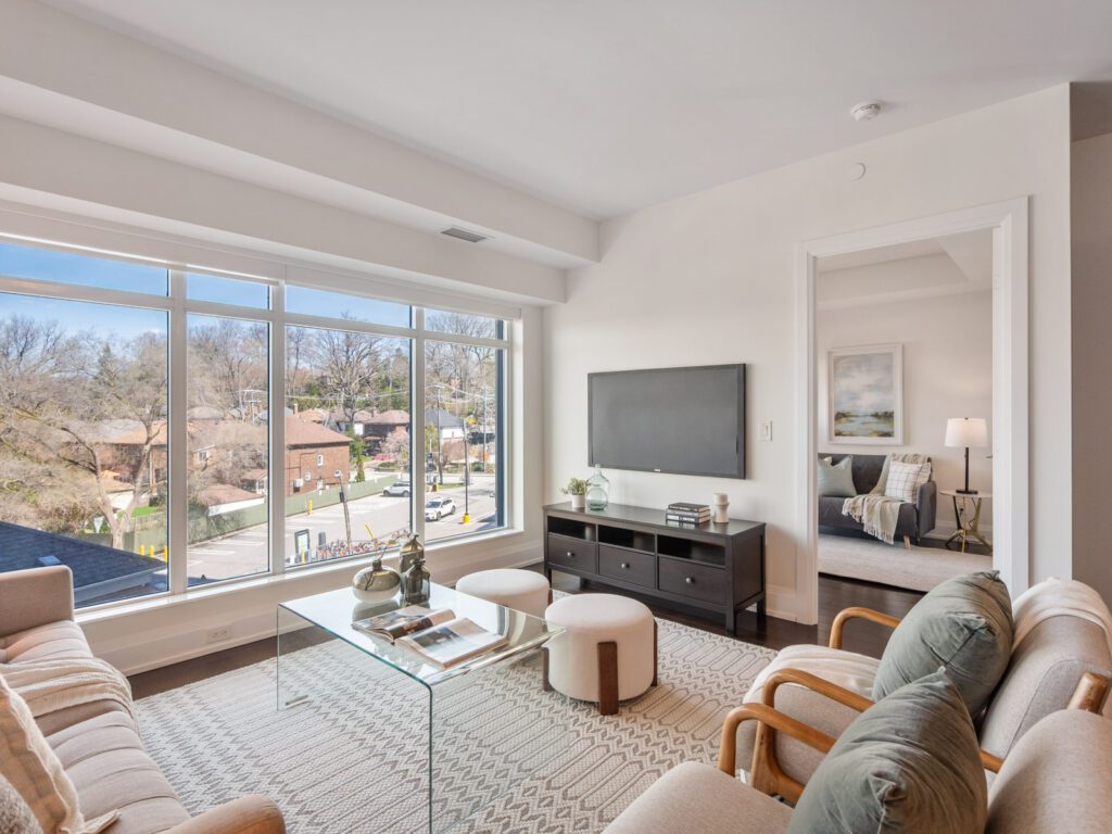 Unlike many condominium layouts, the suite’s square footprint creates a true sense of openness and flow. Expansive wraparound windows along two sides flood the home with natural light throughout the day, while a private tree-top balcony offers the perfect setting for morning coffee or evening aperitifs.