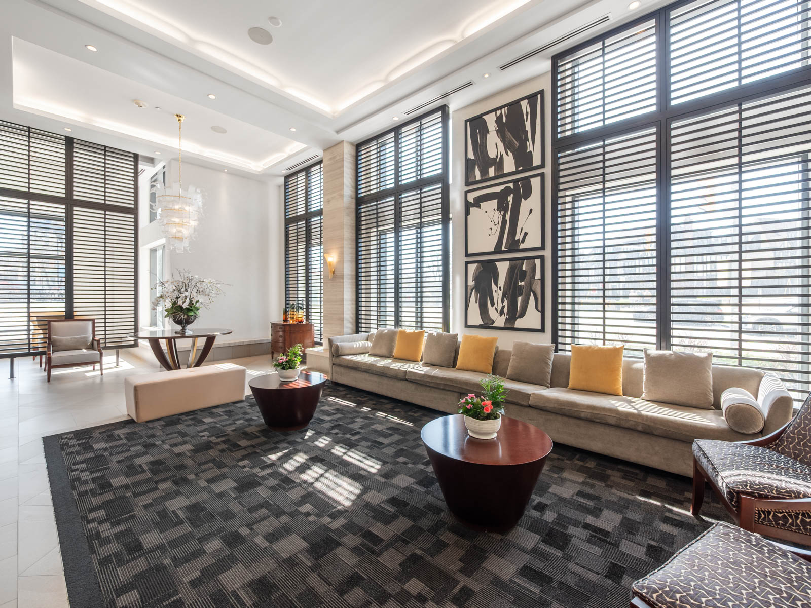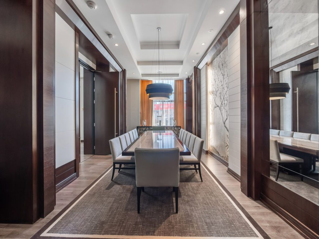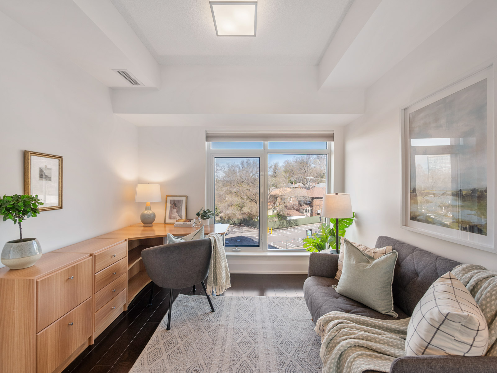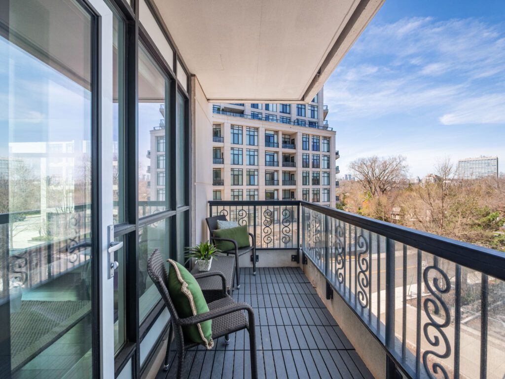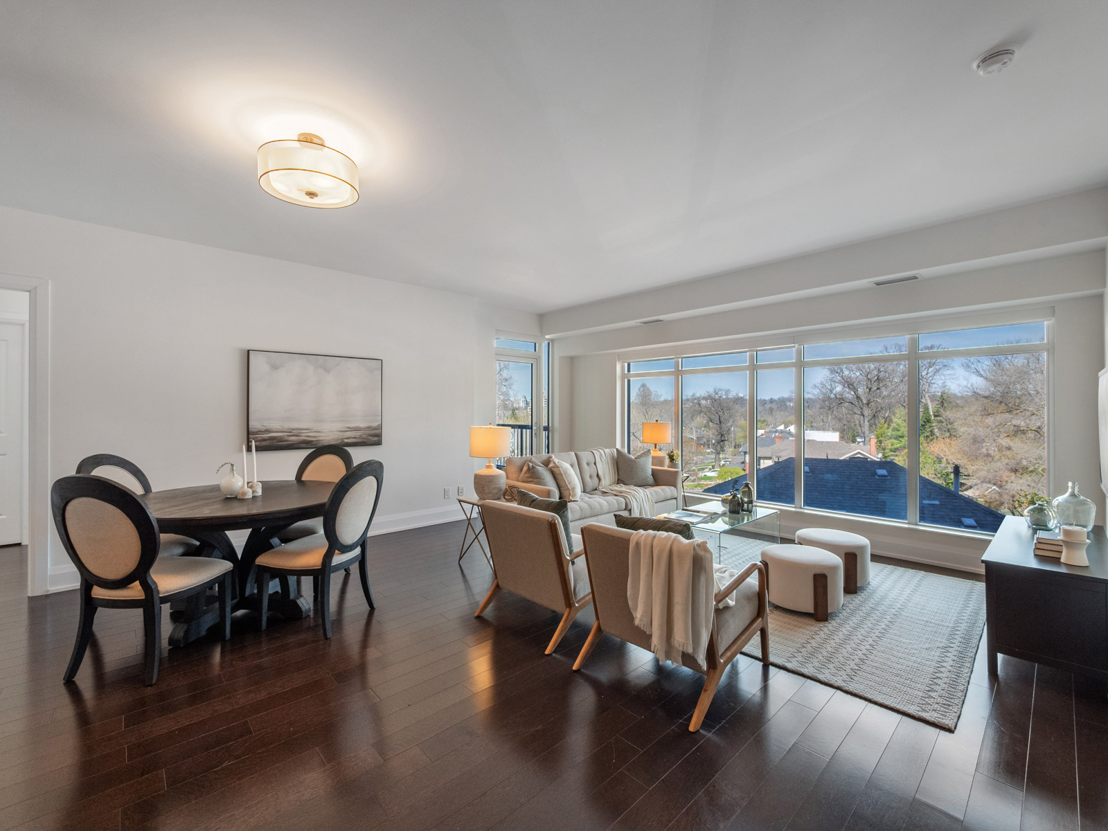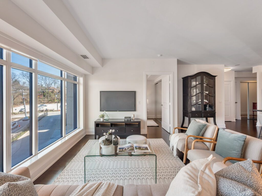 Unlike many condominium layouts, the suite’s square footprint creates a true sense of openness and flow. Expansive wraparound windows along two sides flood the home with natural light throughout the day, while a private tree-top balcony offers the perfect setting for morning coffee or evening aperitifs.