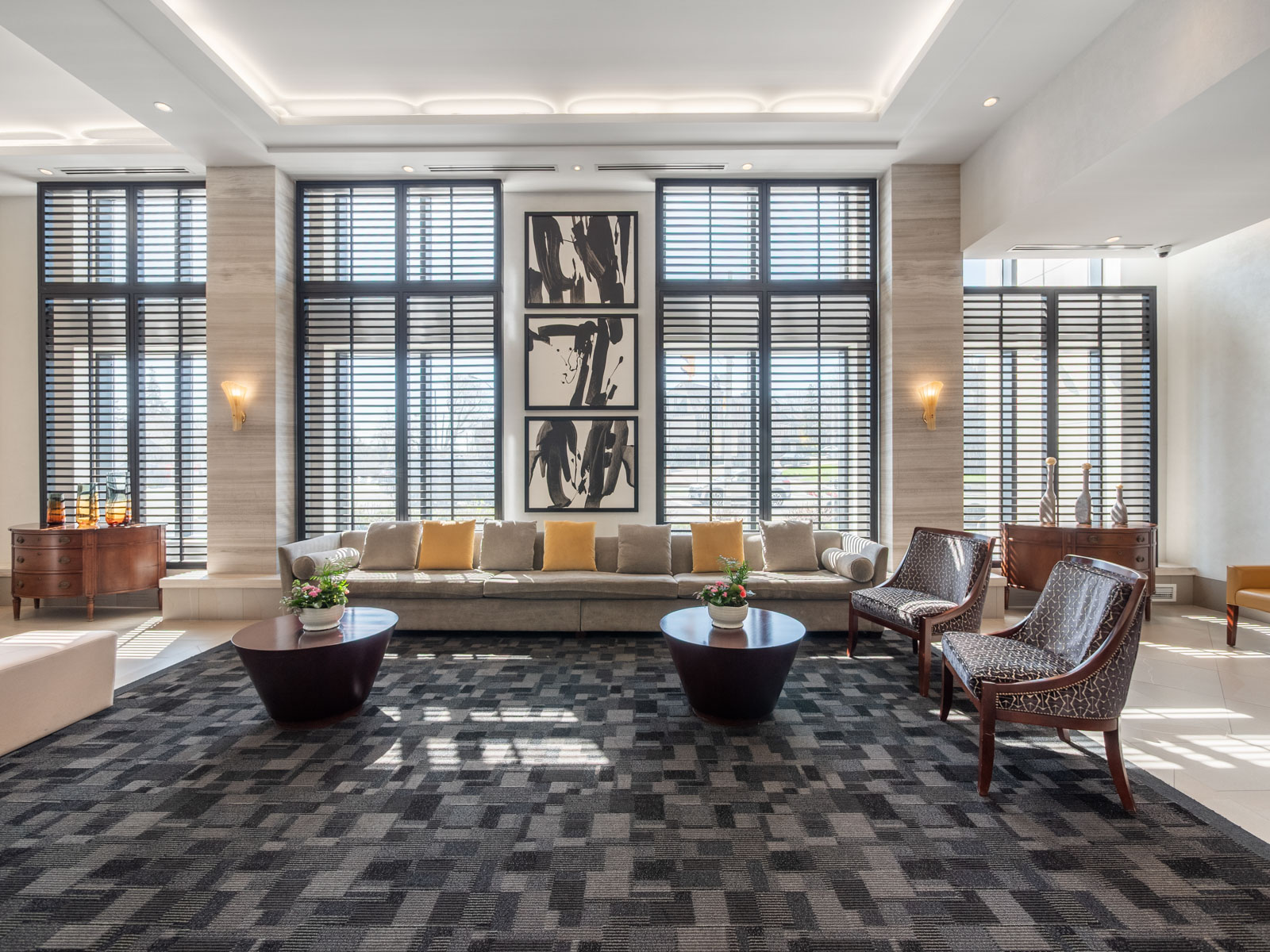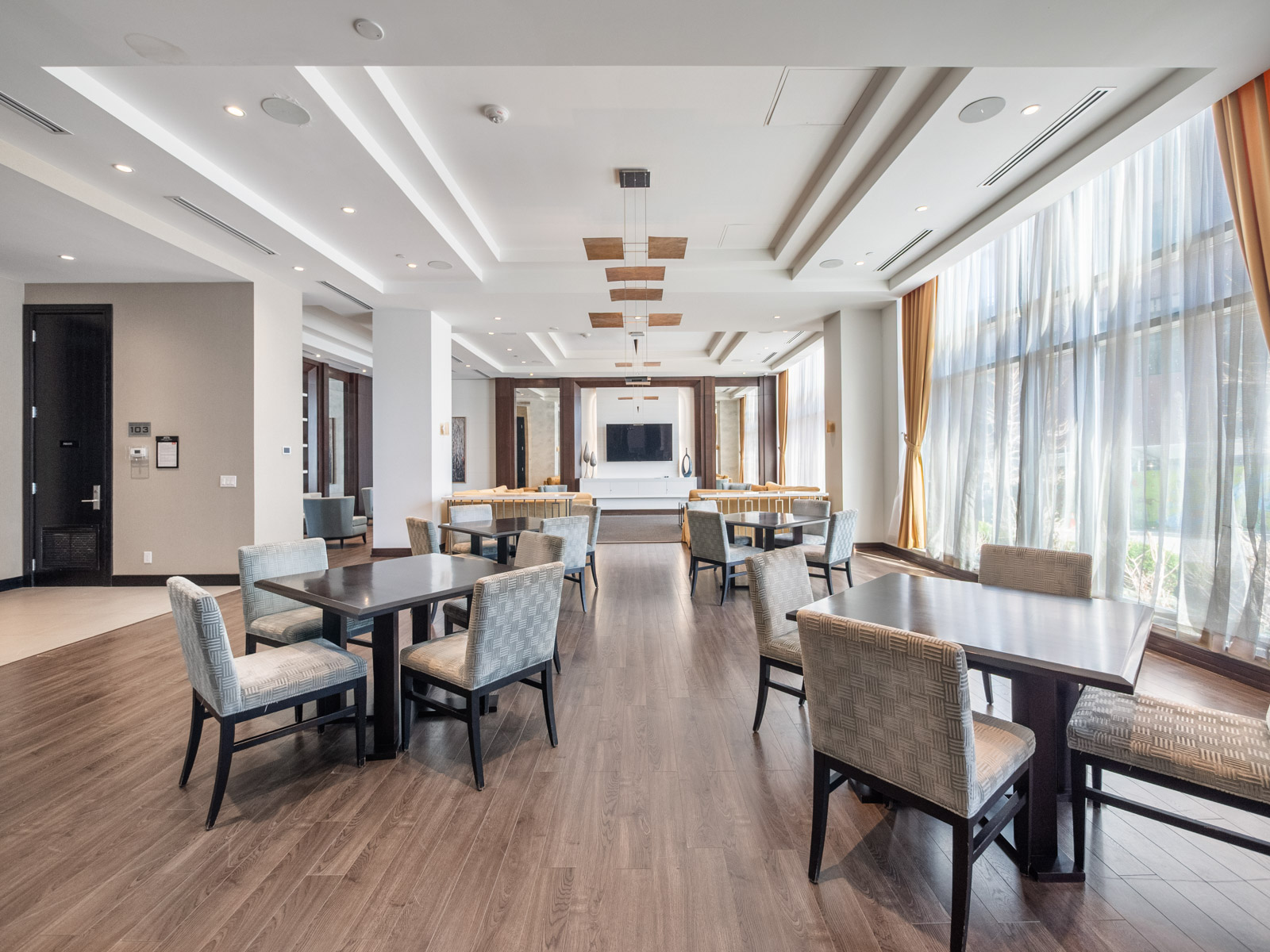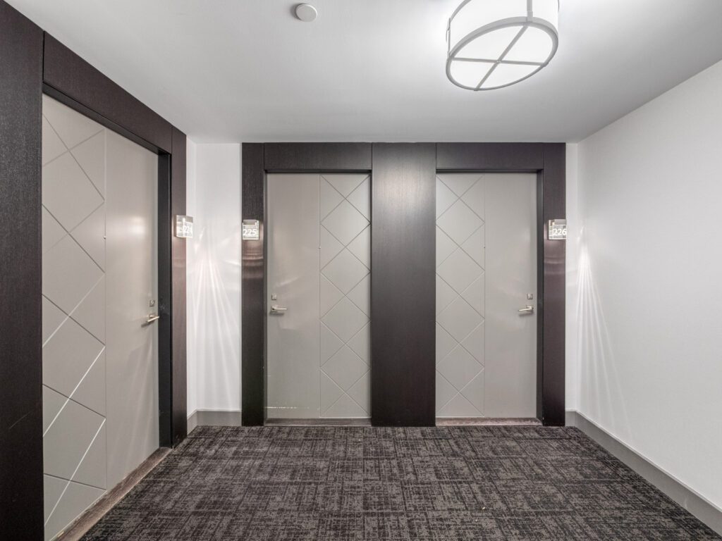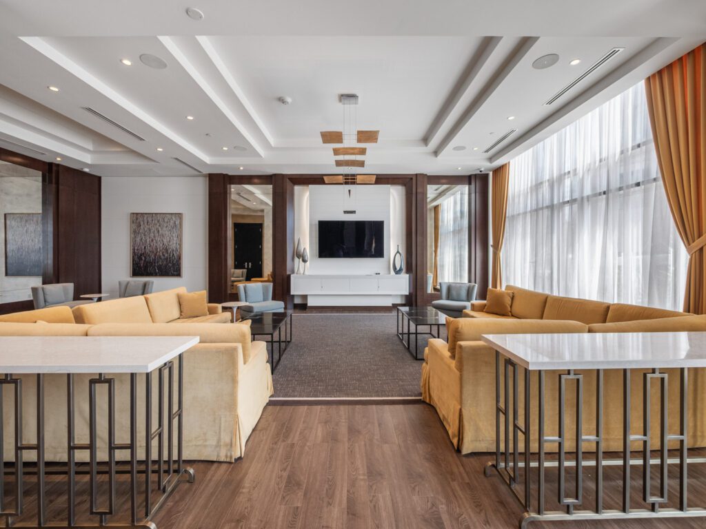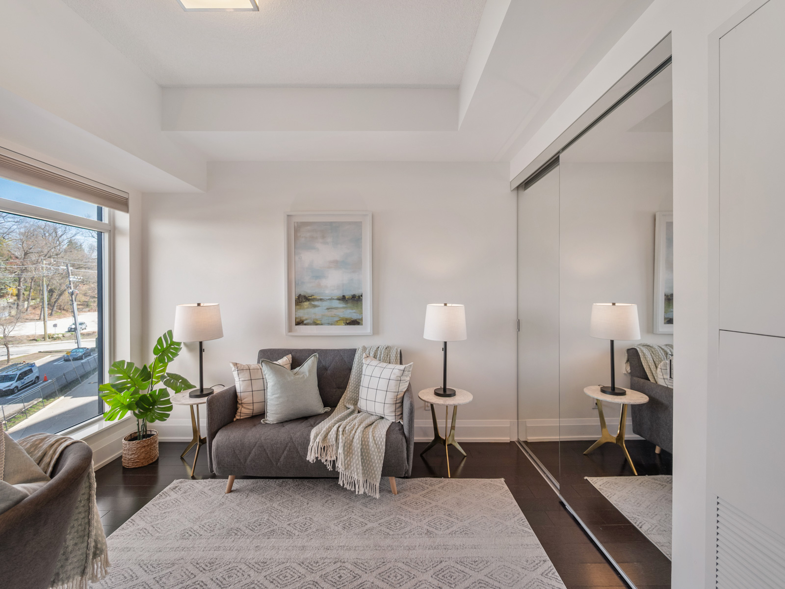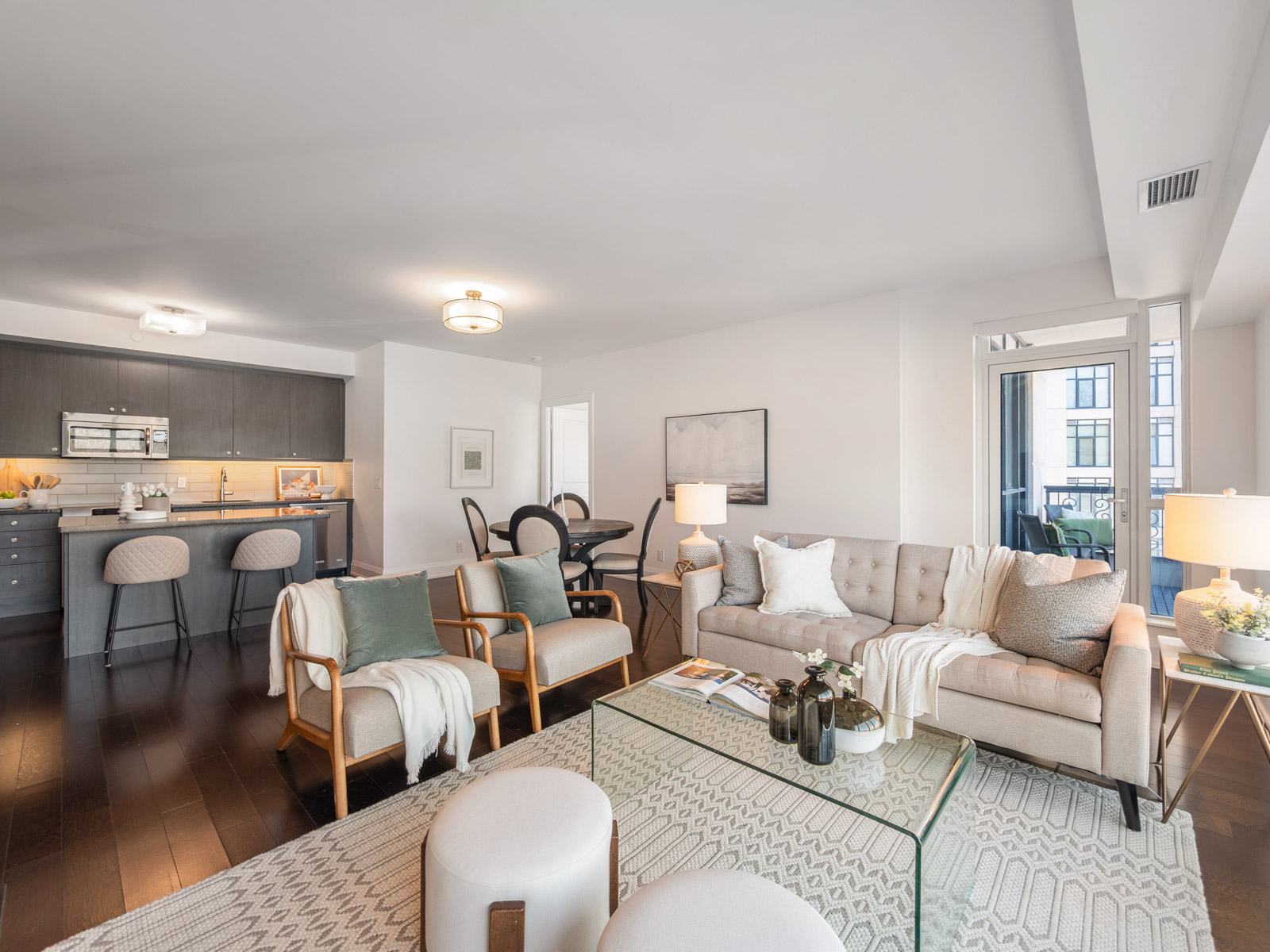 Unlike many condominium layouts, the suite’s square footprint creates a true sense of openness and flow. Expansive wraparound windows along two sides flood the home with natural light throughout the day, while a private tree-top balcony offers the perfect setting for morning coffee or evening aperitifs.