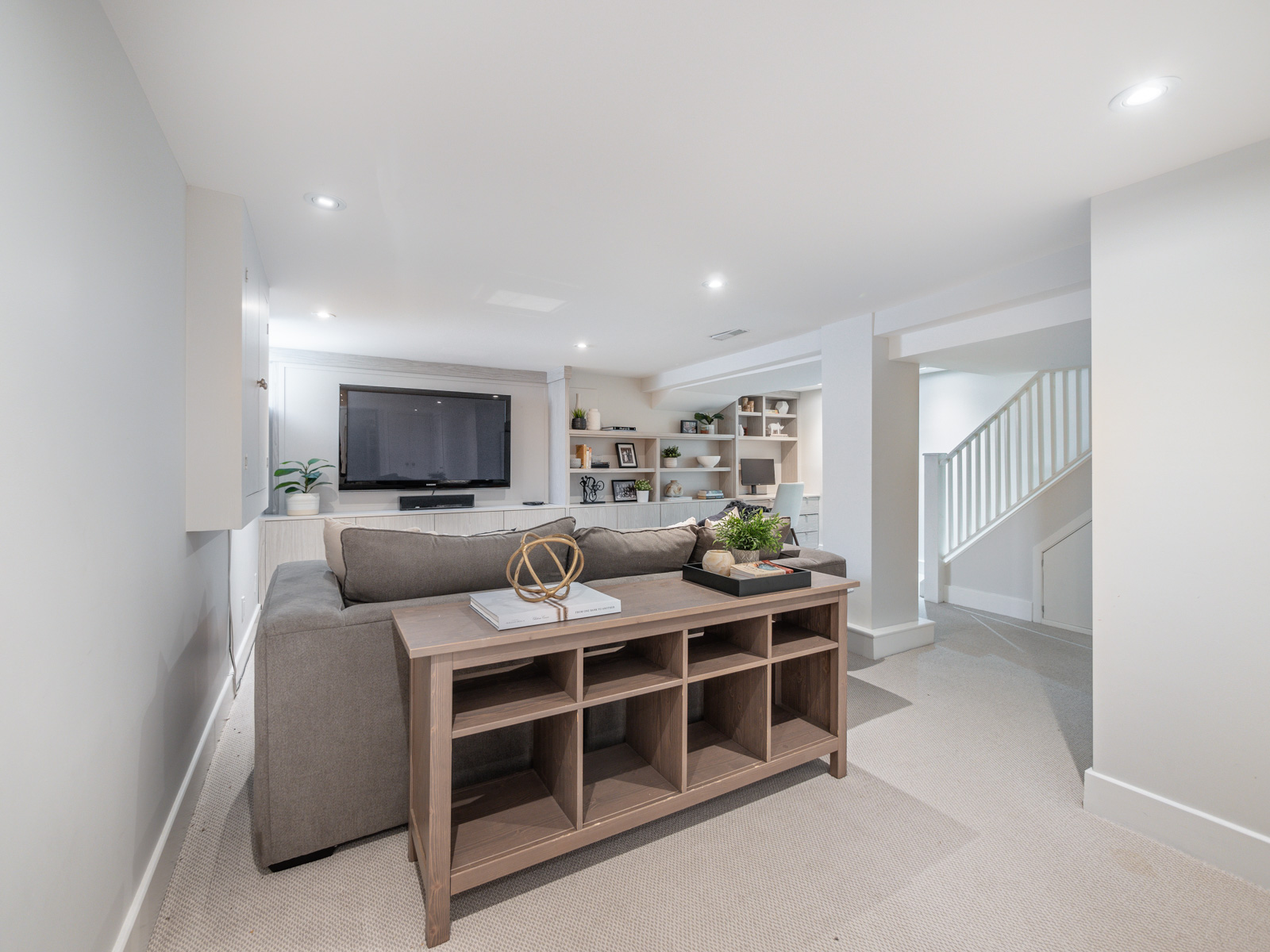 The Lower level features a large recreation room and den area. This space features cozy broadloom & a custom built-in shelving unit with a desk to use as a second work space. The second bathroom is a lovely 3-pc with shower and rain-head. The laundry room is combined with the utilities and offers great space for folding and hanging. Lastly, what would a home be without some room for storage? This one checks that box as well! With tons of built-in shelving, under the stair storage space, and a large storage room at the back with a bar fridge and small chest freezer for your growing family!