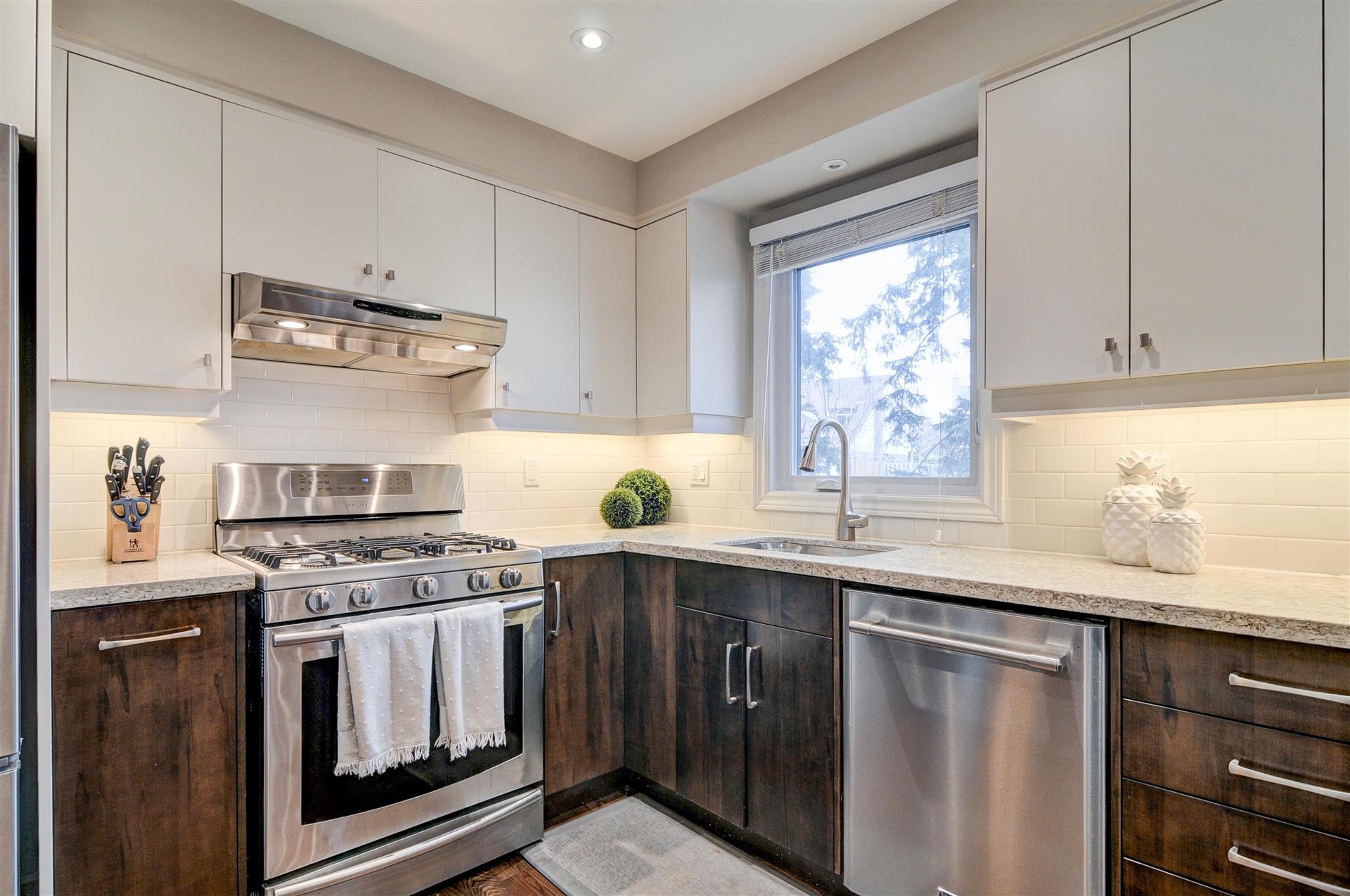 Beautiful family home with bright, open concept living space in sought after South Richvale! Enjoy the stunning main floor renovation with rich hardwood floors, 16′ cathedral ceilings in the living room and cozy wood burning fireplace. Custom designed cook’s kitchen with stainless steel appliances, gas stove, quartz counters and convenient breakfast bar. Three bedrooms offer great family space with a king sized master, walk-in closet and renovated en-suite bath.