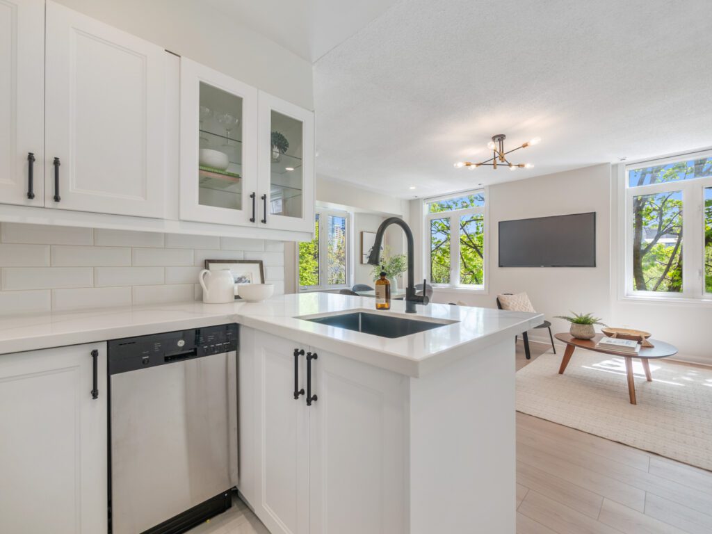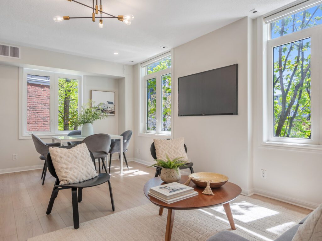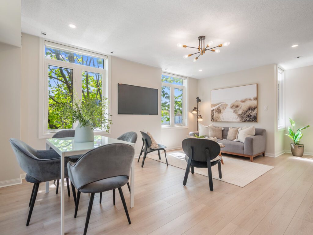 Step into stunning urban living with this newly renovated 3-bedroom, 2-washroom, end unit condo townhouse, nestled in the heart of the vibrant King West, Liberty Village community. Tastefully renovated from top to bottom, this residence exudes contemporary elegance and modern charm at every turn. The brand-new kitchen is a cooks haven, boasting new stainless steel appliances, sleek quartz countertops, a stylish subway tile backsplash, and breakfast bar perfect for culinary creations and entertaining guests in style.