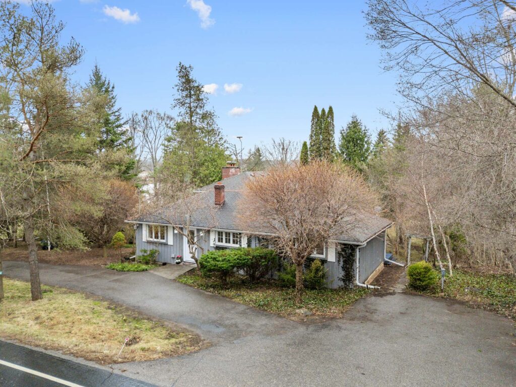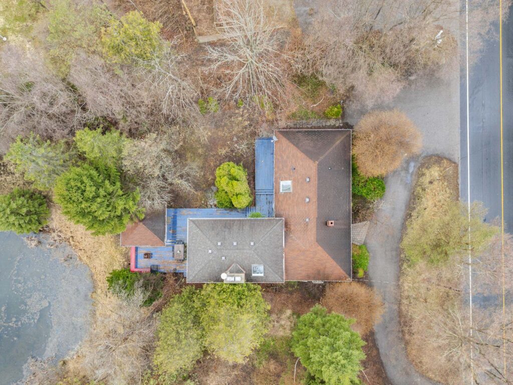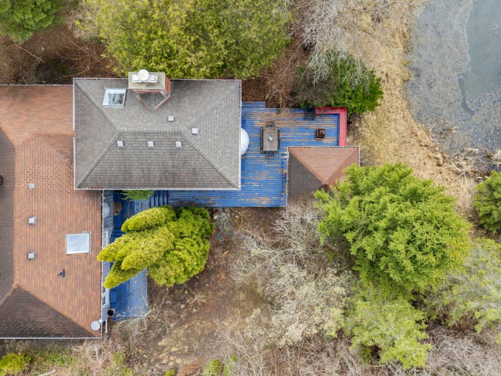The charming living room showcases beautiful built-in bookshelves and large, scenic windows that invite views for days. Natural light floods the dedicated office, highlighted by a vibrant skylight, creating a lovely workspace.