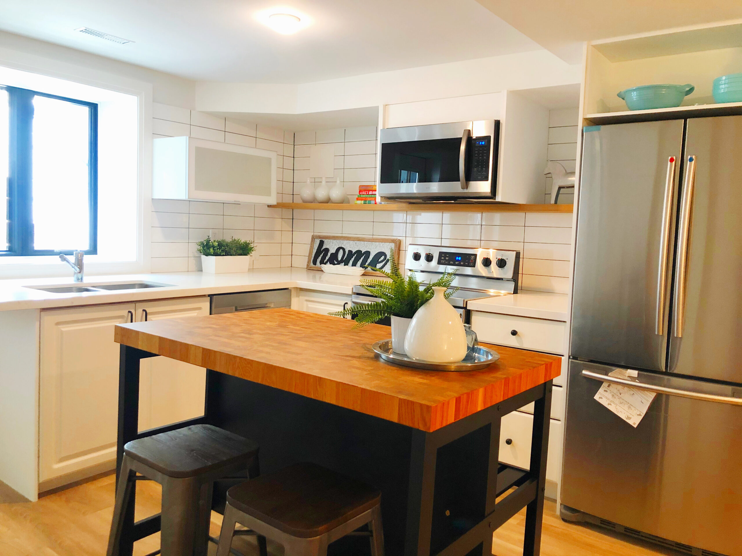 This apartment has been fully renovated to offer a bright, modern living space. The open-concept kitchen features quartz countertops, stainless steel appliances including a microwave, and a centre island with a butcher block countertop plus seating for two. The king-sized bedroom offers ample storage with a built-in double closet.