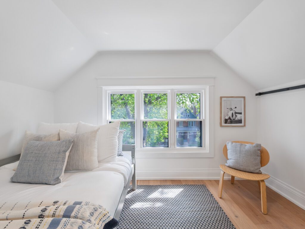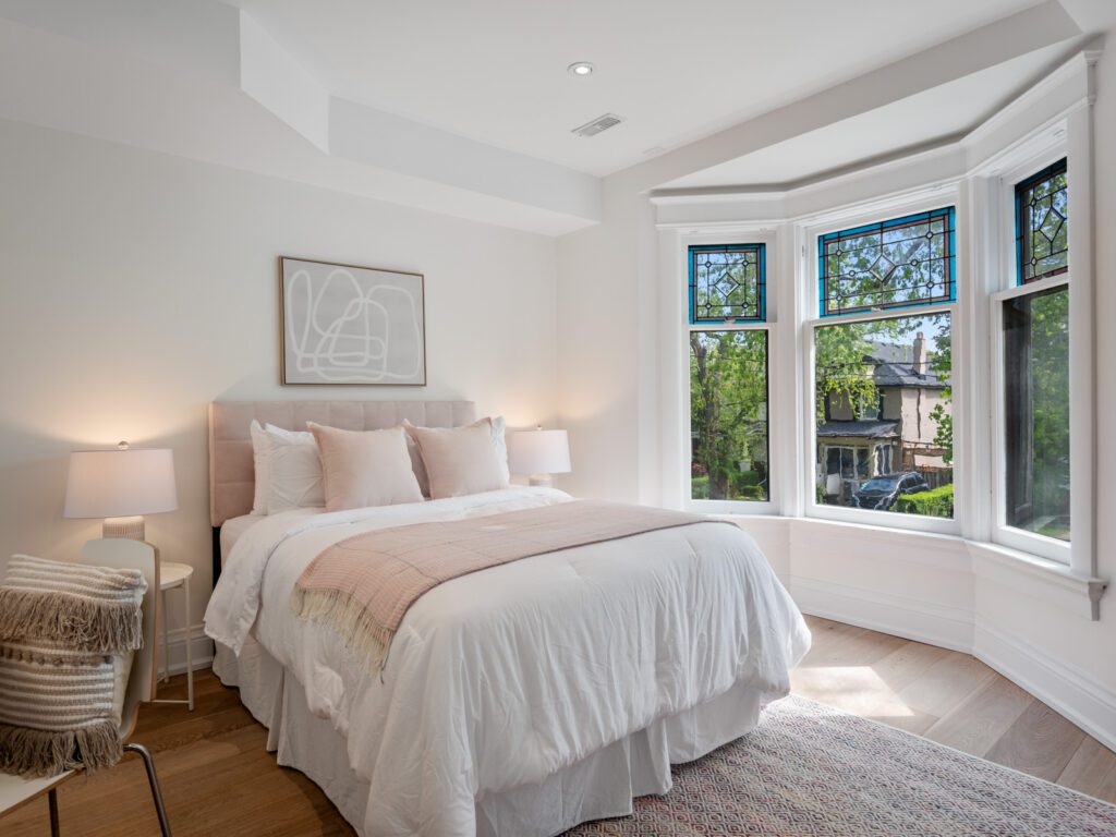 Upstairs, the serene primary suite offers a private retreat with a Juliette balcony, custom walk-in closet, and a spa-inspired five-piece ensuite featuring heated floors, a freestanding tub, and a custom shower. A second bedroom on this level delights with a stained glass bay window and enchanting garden views, while a thoughtfully designed laundry-equipped ensuite adds everyday convenience.