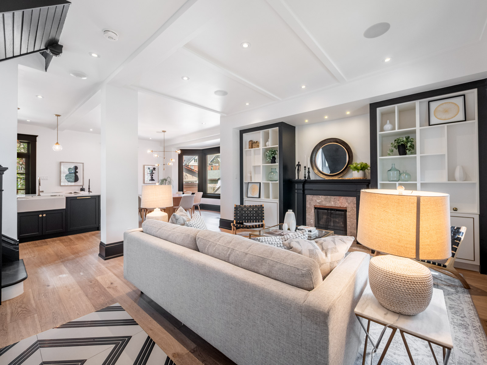 Step inside to discover an airy, open-concept main floor adorned with wide plank white oak floors, soaring 10-foot ceilings, and dramatic black-trimmed doors, windows, and staircase. A convenient powder room is located in the front foyer. The living room is a true showpiece, featuring a sophisticated coffered ceiling, a fireplace flanked by custom built-ins, and abundant natural light that creates a warm, inviting ambiance. Entertain effortlessly in the elegant dining area, perfectly sized for gatherings of eight or more.