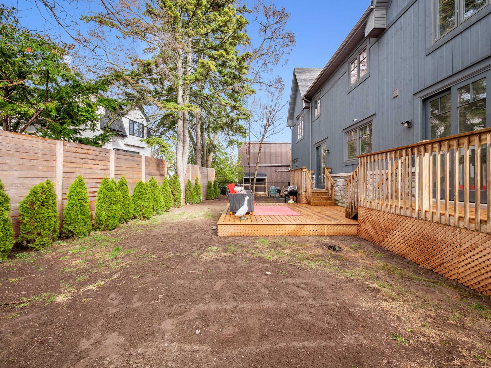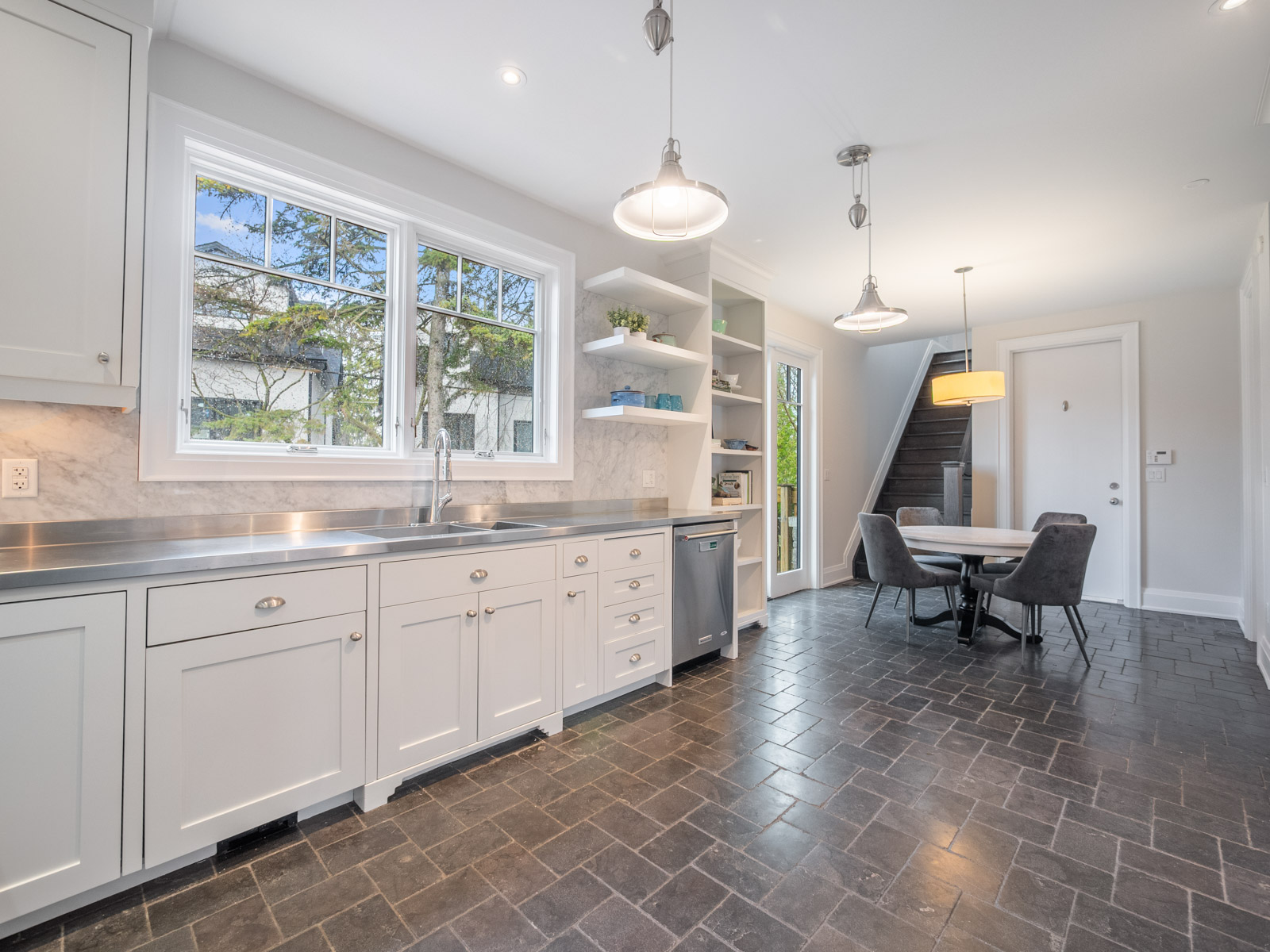 The custom kitchen is a chef’s dream, boasting stainless steel appliances, a sleek countertop, marble backsplash, two sinks and elegant limestone flooring. Whether preparing everyday meals or entertaining on a grander scale, this kitchen offers both beauty and practicality. From here, enjoy easy access to the backyard through two walkouts that lead to a fabulous deck—perfect for hosting summer BBQs or relaxing in your private outdoor retreat.