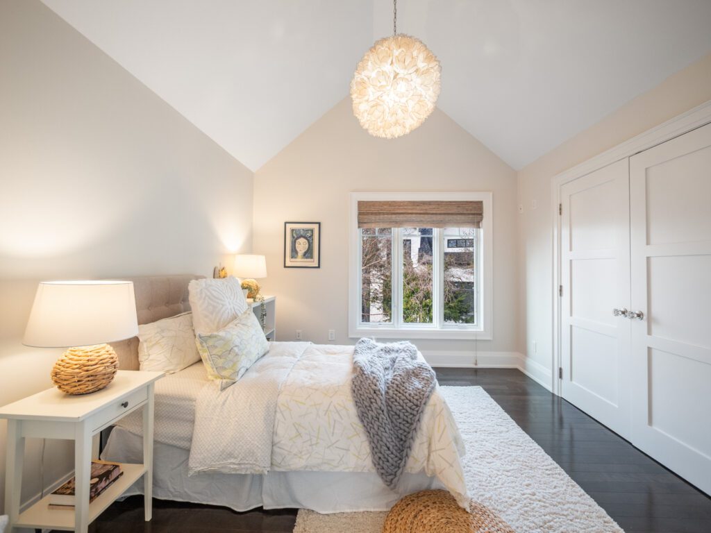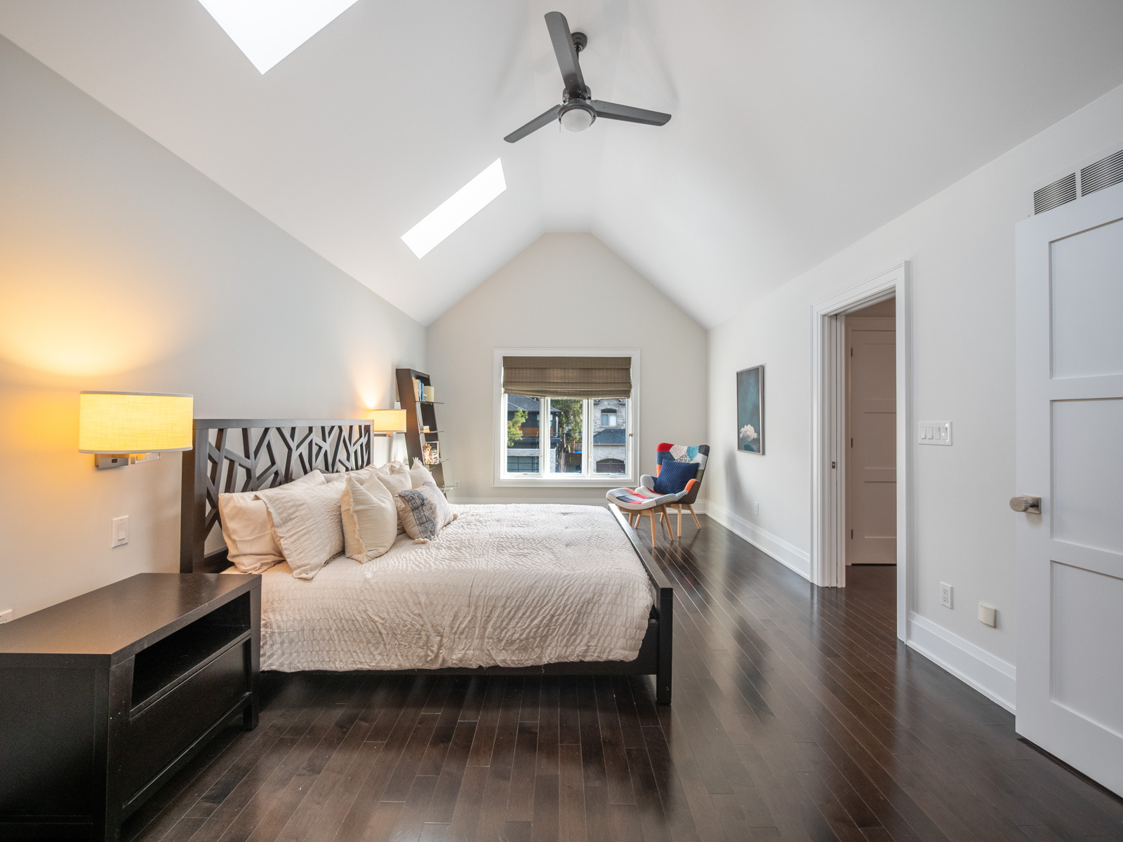 Upstairs, the large primary suite is a true sanctuary. Featuring vaulted ceilings, skylights, and a gas fireplace, it also offers the luxury of a private staircase leading back to the main floor. The spa-inspired 5-piece ensuite bath is outfitted with double sinks, marble counters, a cast iron soaker tub, and a separate shower—everything you need for your daily escape. The second bedroom overlooks the peaceful backyard and includes its own 4-piece ensuite, while the third and fourth bedrooms are connected by a stunning 5-piece Jack and Jill bathroom. The third bedroom’s soaring vaulted ceilings and natural light make it a standout space.