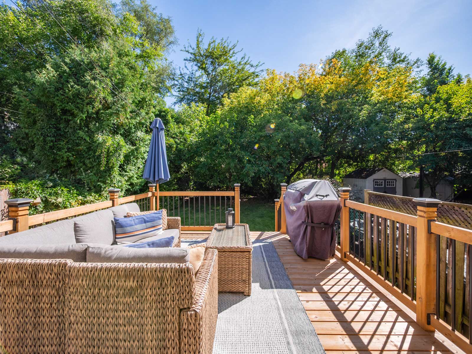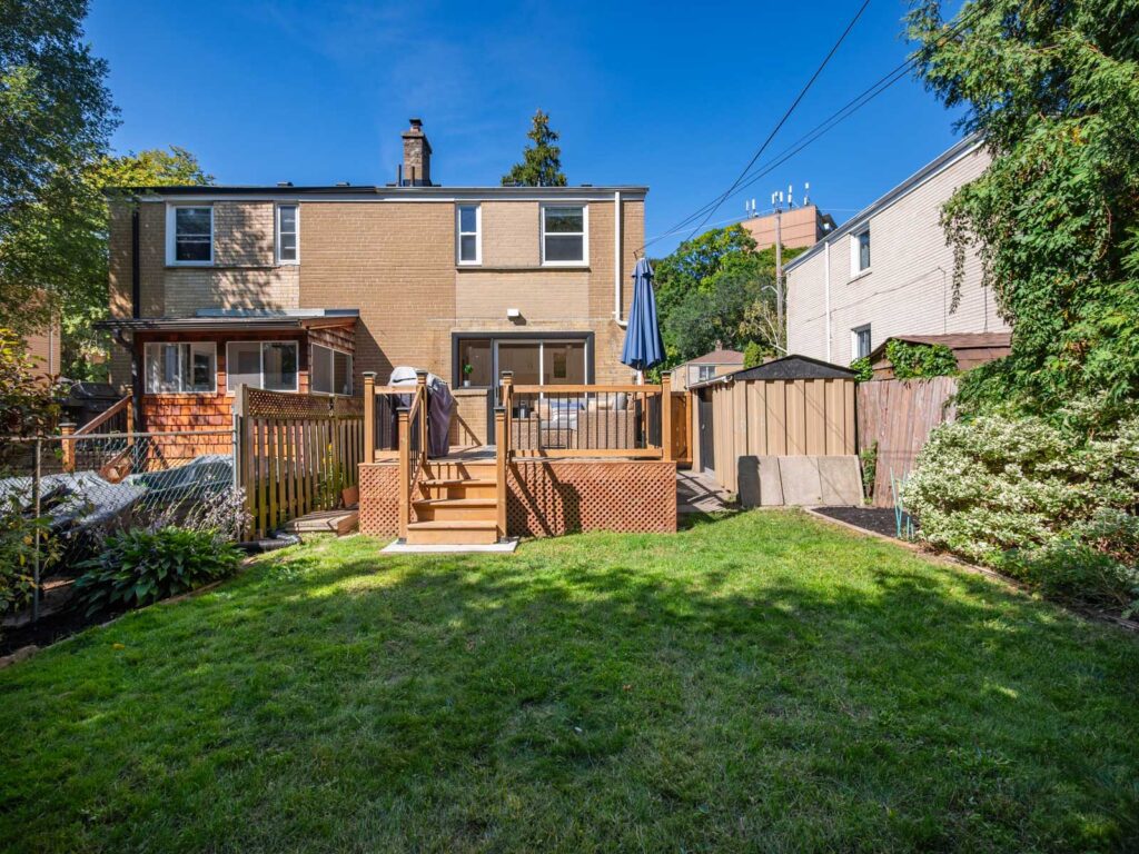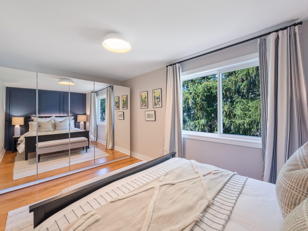 The renovated kitchen (2023) is both stylish and functional, with quartz countertops, stainless steel appliances, and a walkout to a private backyard deck. With mature trees surrounding the yard, the space feels secluded and tranquil-your own retreat right at home. Upstairs, three generous bedrooms offer flexibility for family life, guests, or a home office. The primary bedroom features built-in mirrored cabinetry and a custom wainscoted accent wall, adding character and charm. A modern four-piece bathroom with a tiled glass shower completes this level.