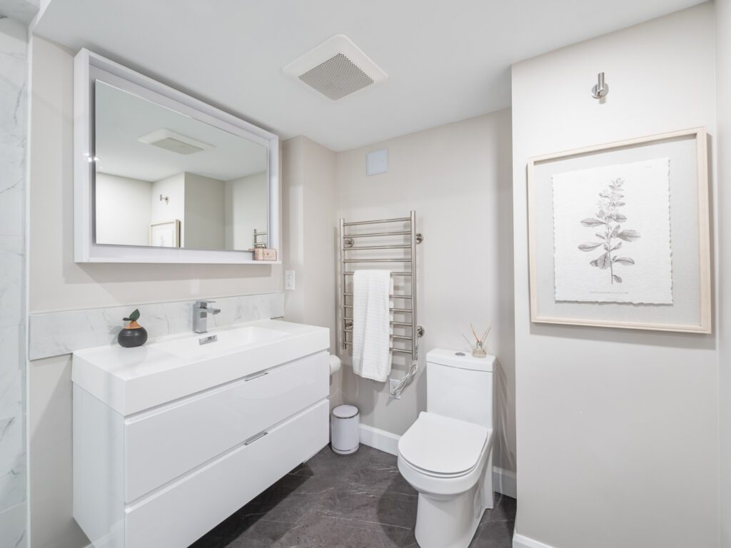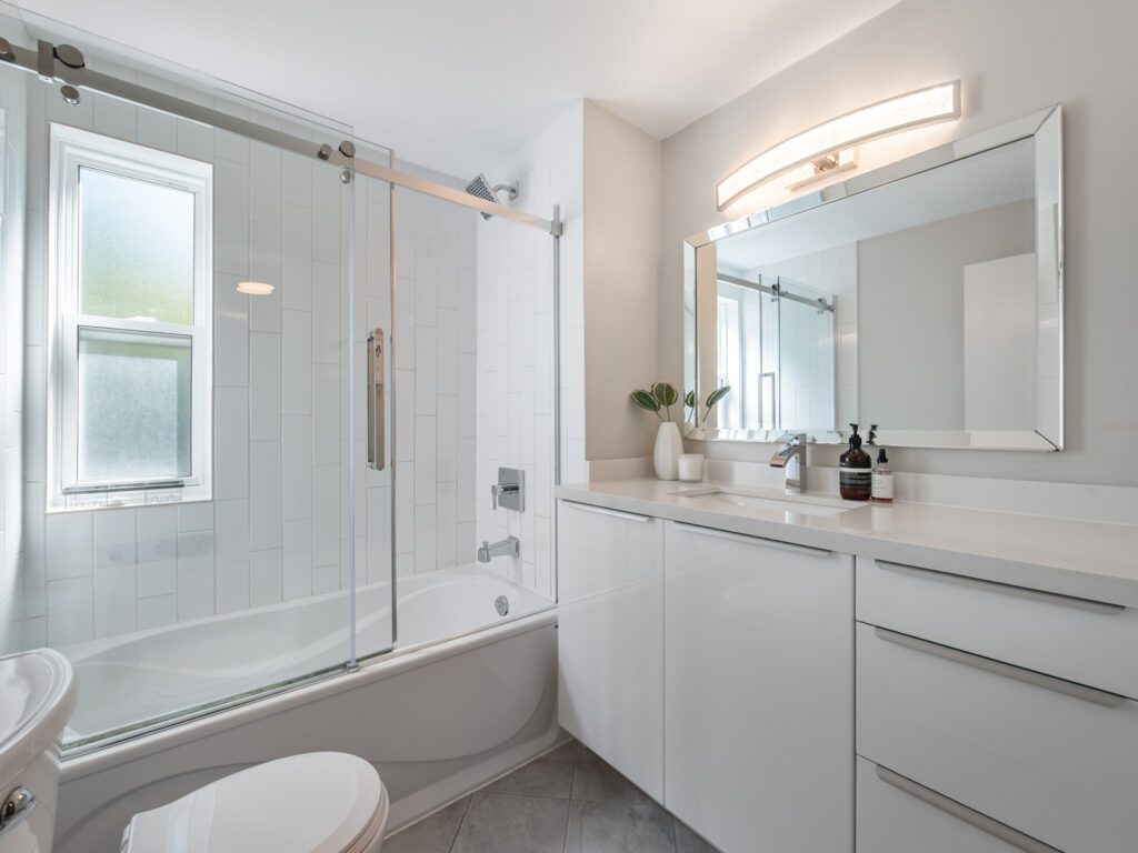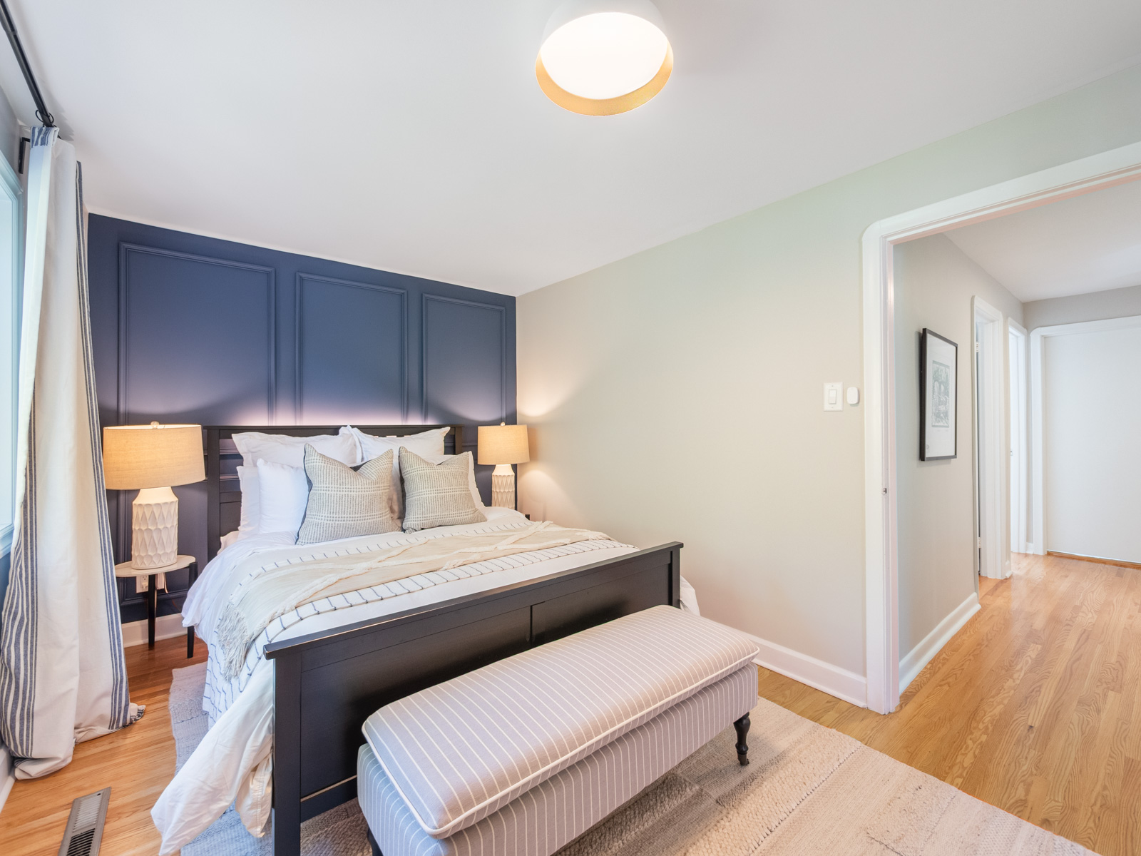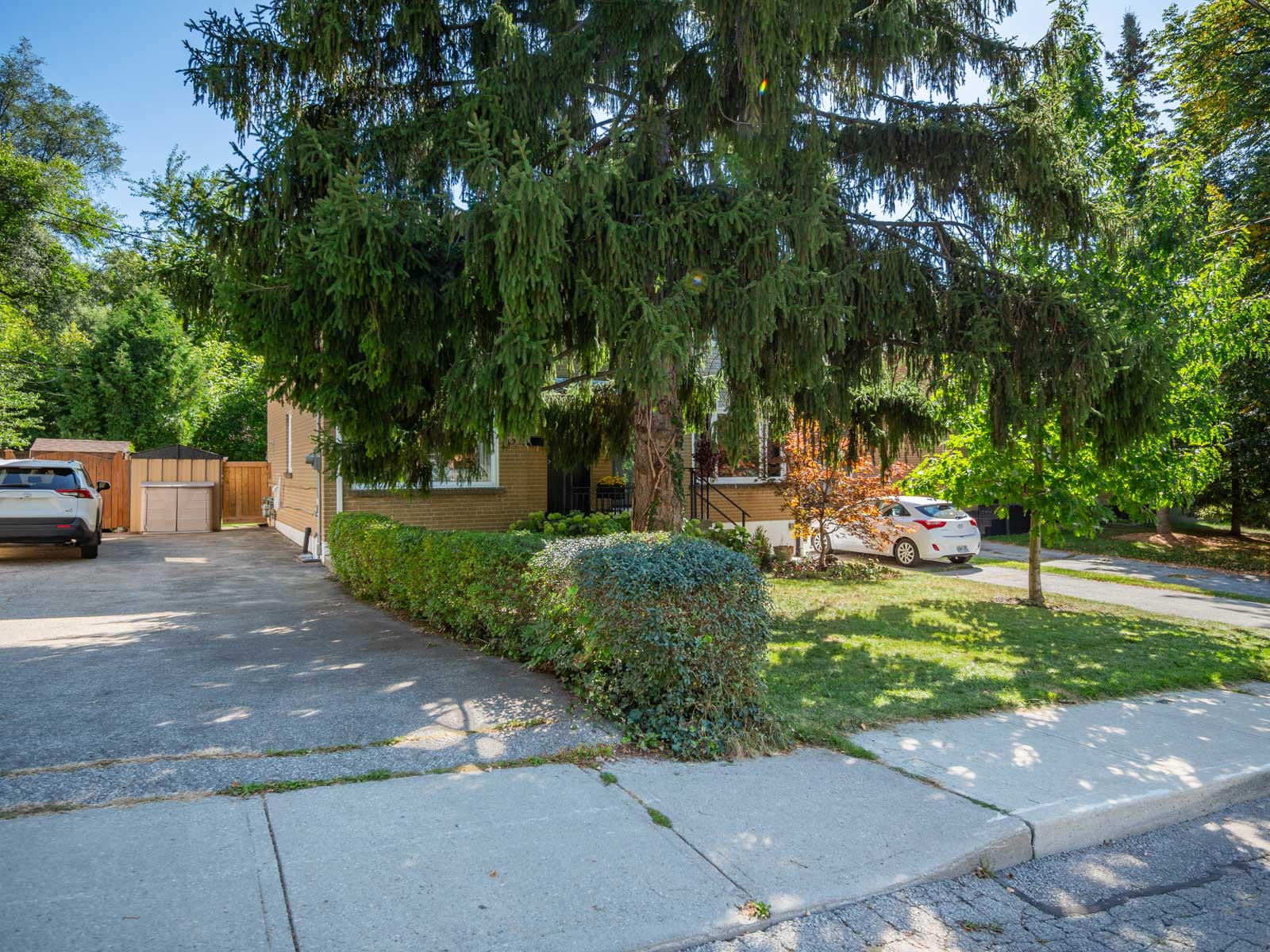 The renovated kitchen (2023) is both stylish and functional, with quartz countertops, stainless steel appliances, and a walkout to a private backyard deck. With mature trees surrounding the yard, the space feels secluded and tranquil-your own retreat right at home. Upstairs, three generous bedrooms offer flexibility for family life, guests, or a home office. The primary bedroom features built-in mirrored cabinetry and a custom wainscoted accent wall, adding character and charm. A modern four-piece bathroom with a tiled glass shower completes this level.