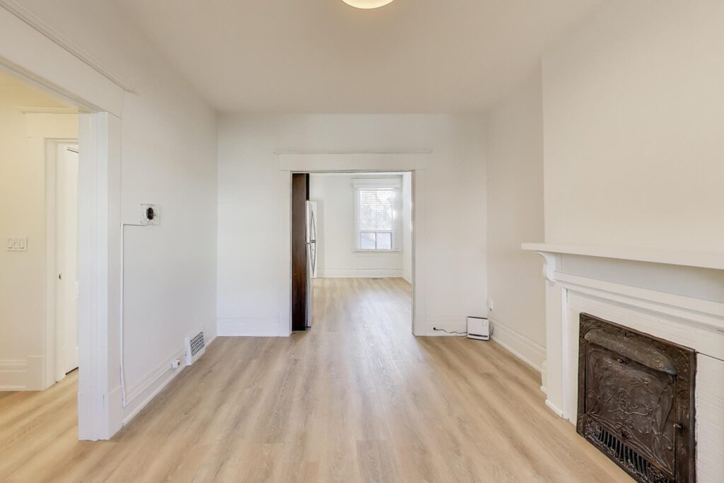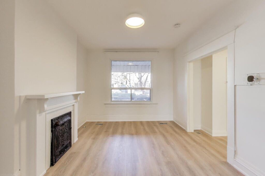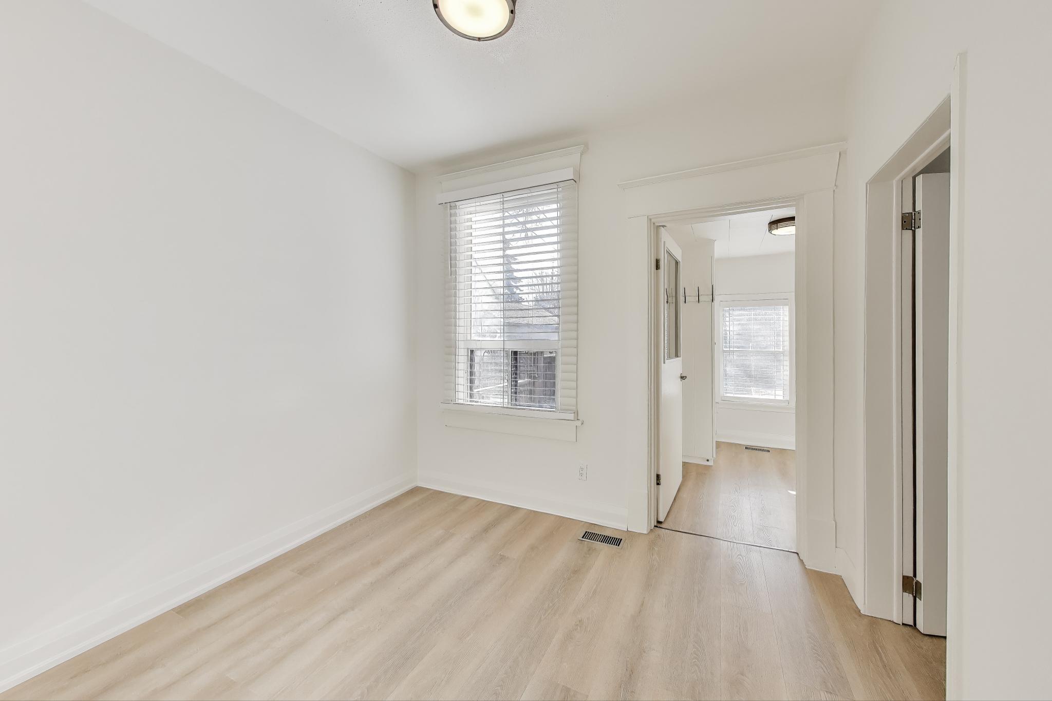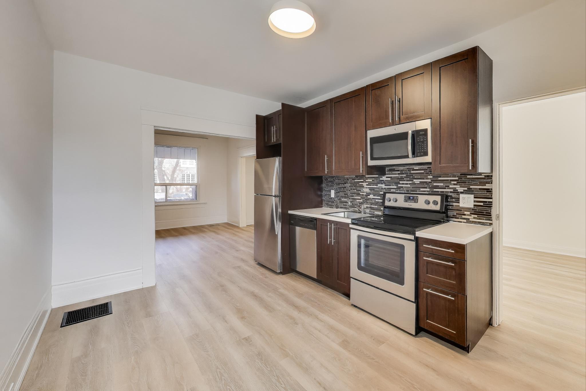 Bright and modern main-floor unit offering nearly 700 sq. ft. of comfortable living space with both front and rear access. Recently updated throughout, this unit has recently been painted and brand new flooring installed. The living room features an ornamental fireplace and oversized window overlooking the front yard. The upgraded eat-in kitchen includes new cabinetry, full-sized stainless steel appliances, including a dishwasher, making daily living a breeze. The bedroom at the rear comes with and a fully renovated bathroom ensuite with a walk-in shower. The flexible 1+1 layout provides an extra room that works perfectly as a home office, nursery, or den. Enjoy the convenience of one parking space and shared on-site laundry (coin-operated washer, dryer is free).