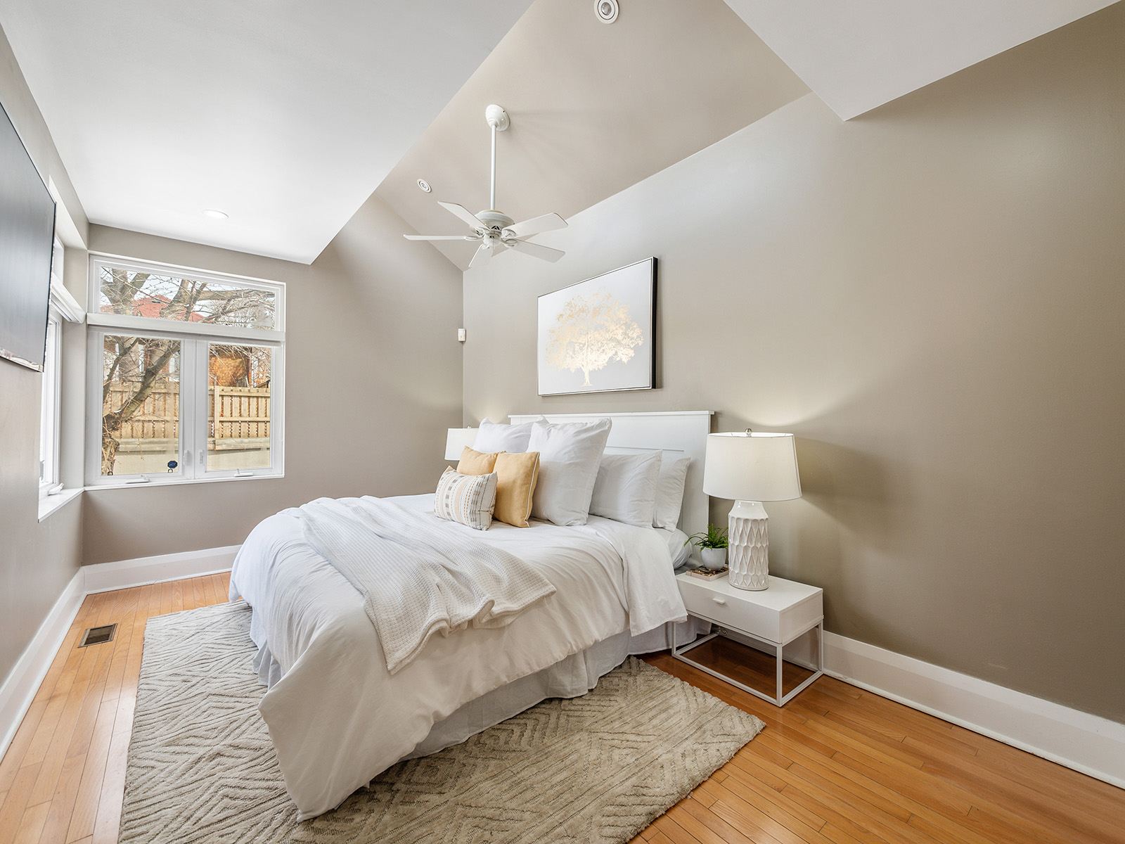 The oversized primary bedroom fits a king-size bed with ease. Everyone will love the walk-in closet, vaulted ceilings, and picture windows overlooking the garden. Its a calm, beautiful space.